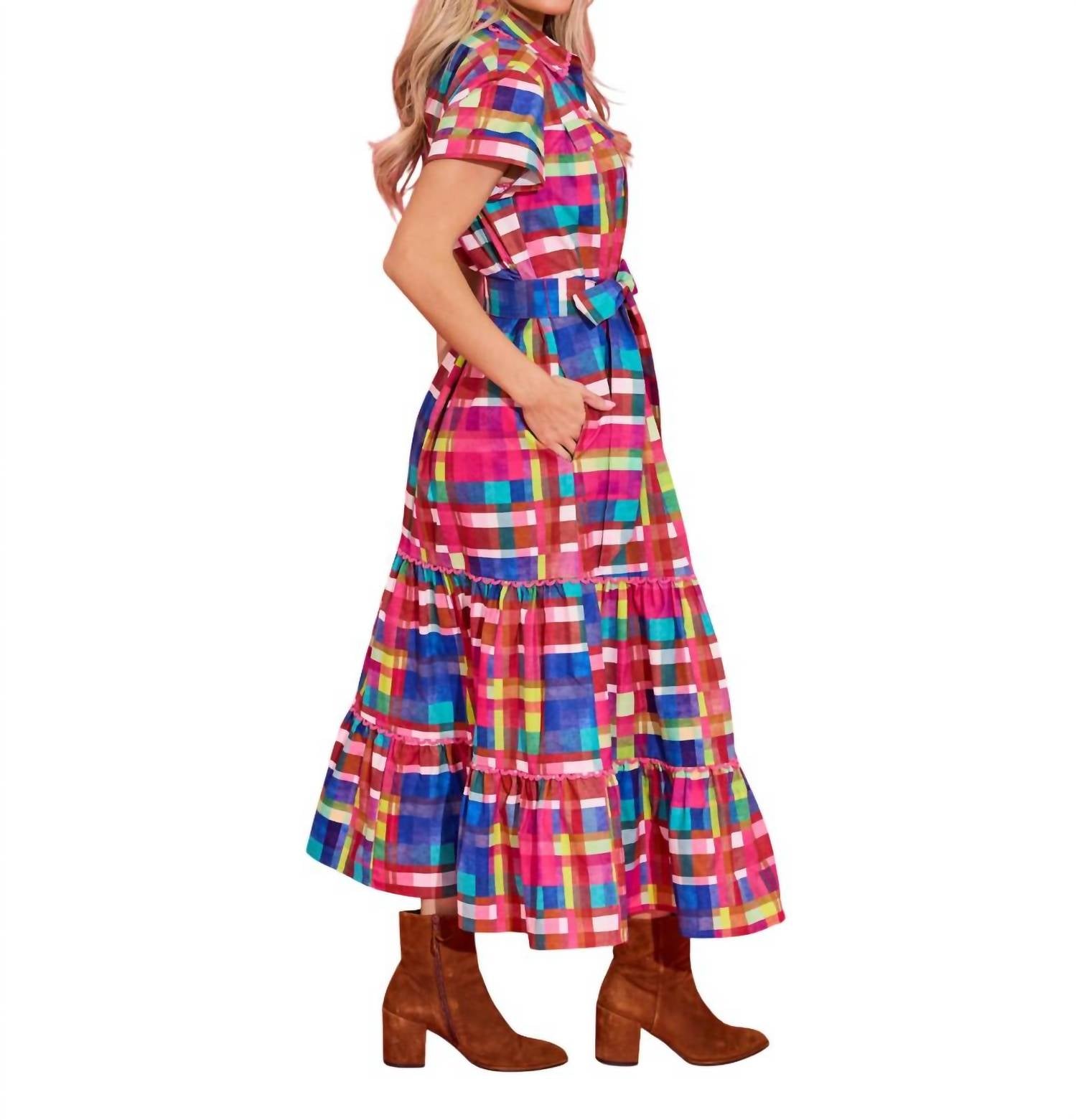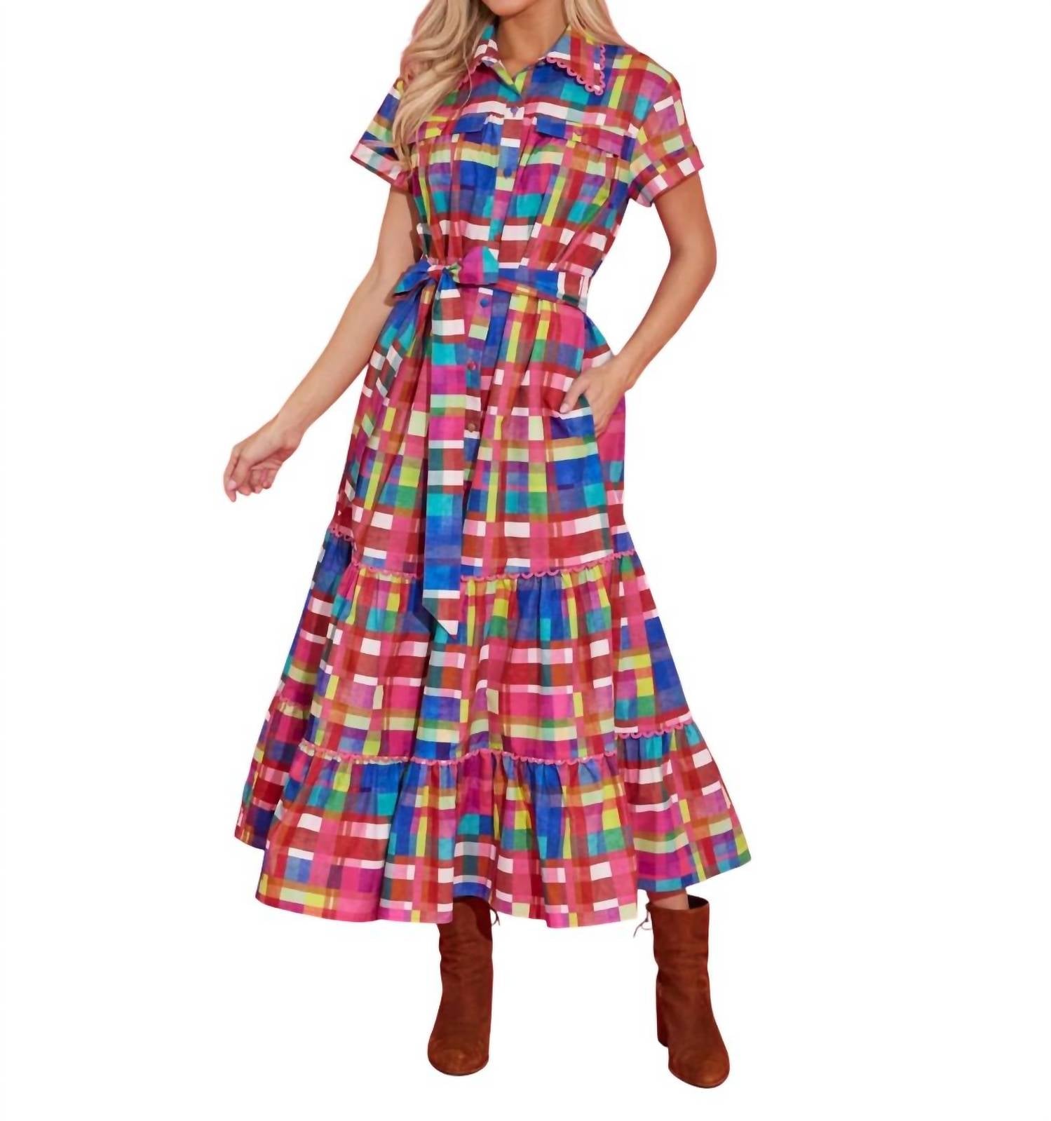 Who doesn't love a good maxi dress? This one you'll be reaching for season after season. Embrace timeless elegance with the Rachel Dress by Alden Adair, a stunning A-line maxi crafted for any occasion. This dress showcases short sleeves, a button closure, and a matching adjustable belt, all in a plaid and check Fall Multi design. Composition: 100% Polyester. Care: Machine wash cold, tumble dry low.