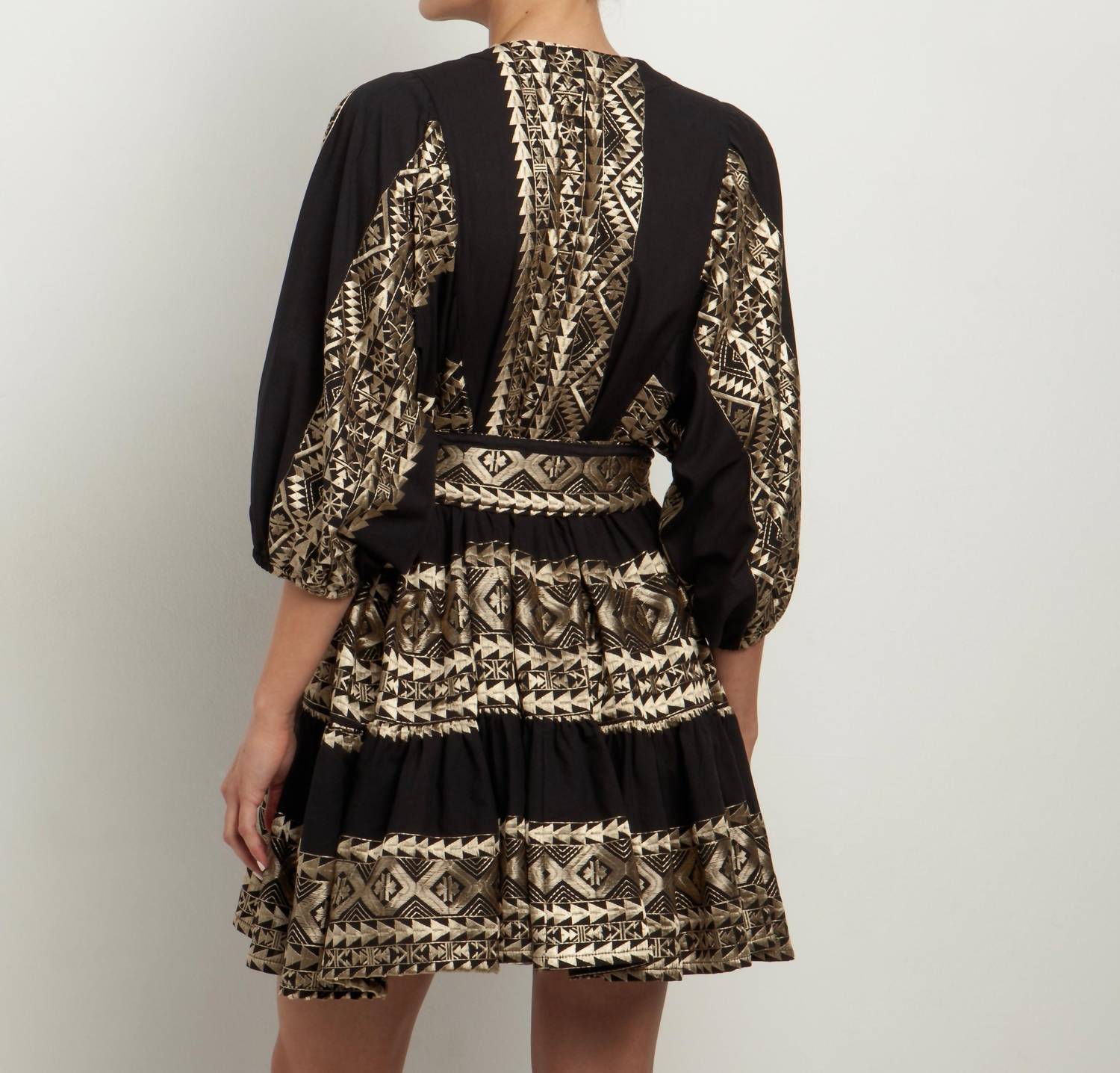 Introducing the Chemisier Short Sleeve Belted Dress by Greek Archaic Kori, perfect for women seeking dinner party sophistication. This mini dress in black and gold features three-quarter bloused sleeves and an elegant V-neckline, enhanced by beautiful gold triangle stitching and a flattering belted waist. Crafted from 100% cotton and made in Greece, it embodies the quiet luxury trend. Closure: Pull on.