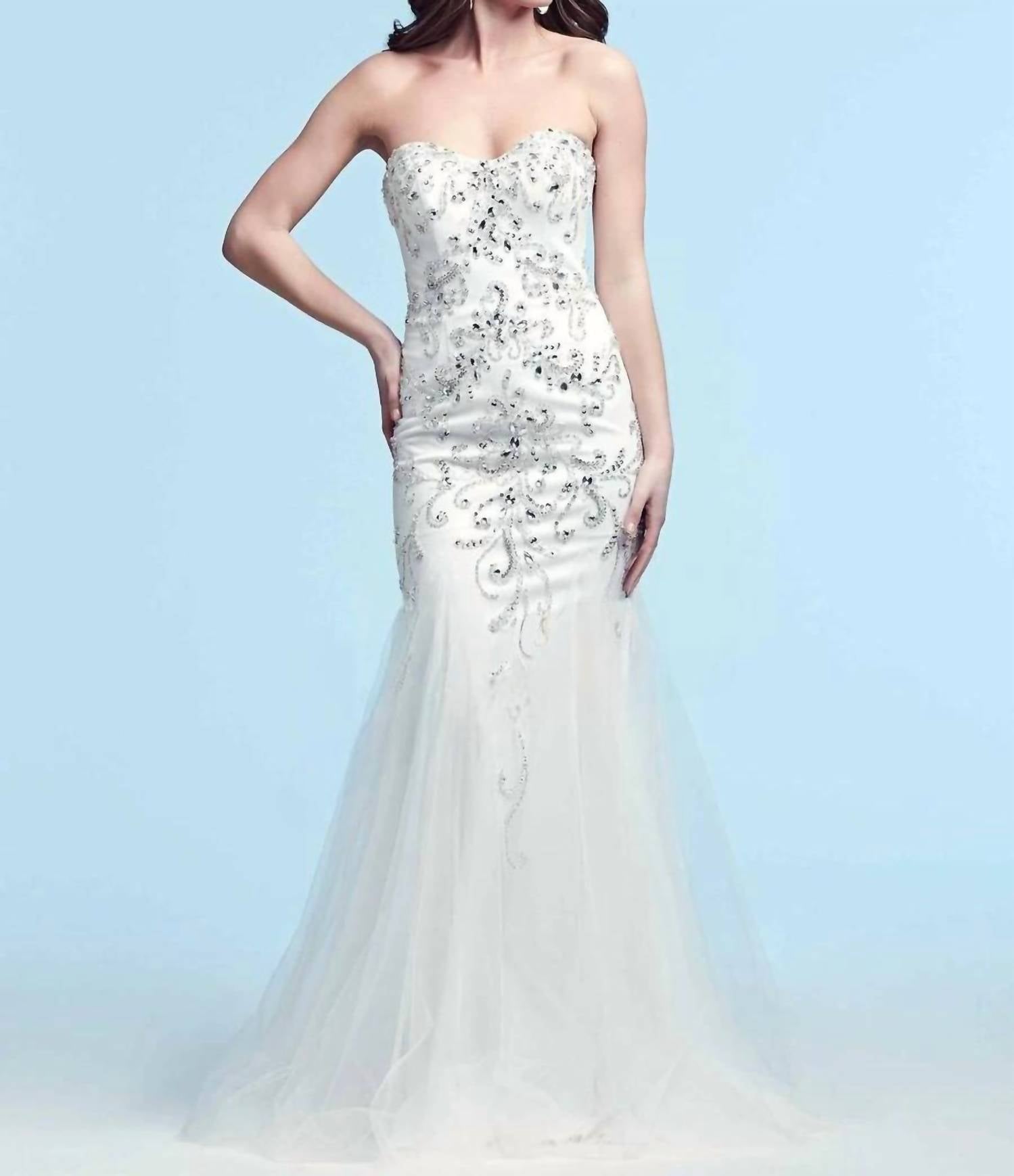 Turn heads in the cutest and most flattering evening dress. Introducing the Embellished Mermaid Gown by MAC DUGGAL, a stunning choice in White/Silver for your next prom event. This strapless gown features a sweetheart neckline, adorned with shimmering silver stones, sequins, and beading in a captivating floral pattern that flows through the dropped bodice. The dress elegantly transitions into a mermaid silhouette with minimal volume and beautiful tulle tuffs that extend into a delicate sweep train. Closure: Zip closure. Crafted with care for an unforgettable evening.