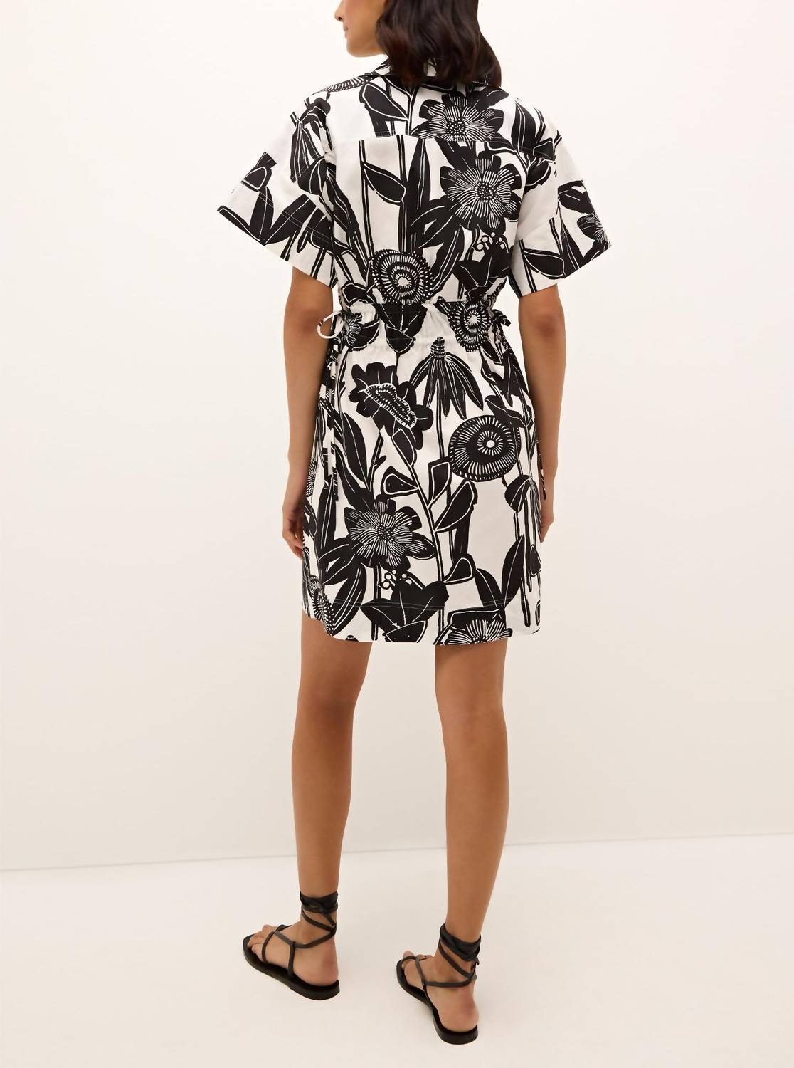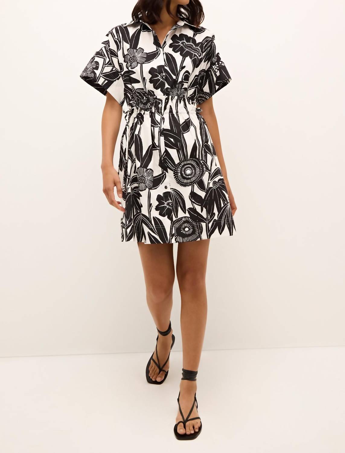 The perfect mini dress for those warmer months. The Billie Mini Dress by Marie Oliver is a charming piece perfect for both work and play, graced with a bold black-and-white botanical print. This short sleeve, A-line dress boasts a unique slip-on silhouette with a button front placket and an elastic waist with drawstrings for an adjustable fit. Crafted from 100% cotton, it offers a relaxed drop-shoulder design ensuring comfort and versatility. Care instructions: machine wash on a gentle cycle and hang dry.