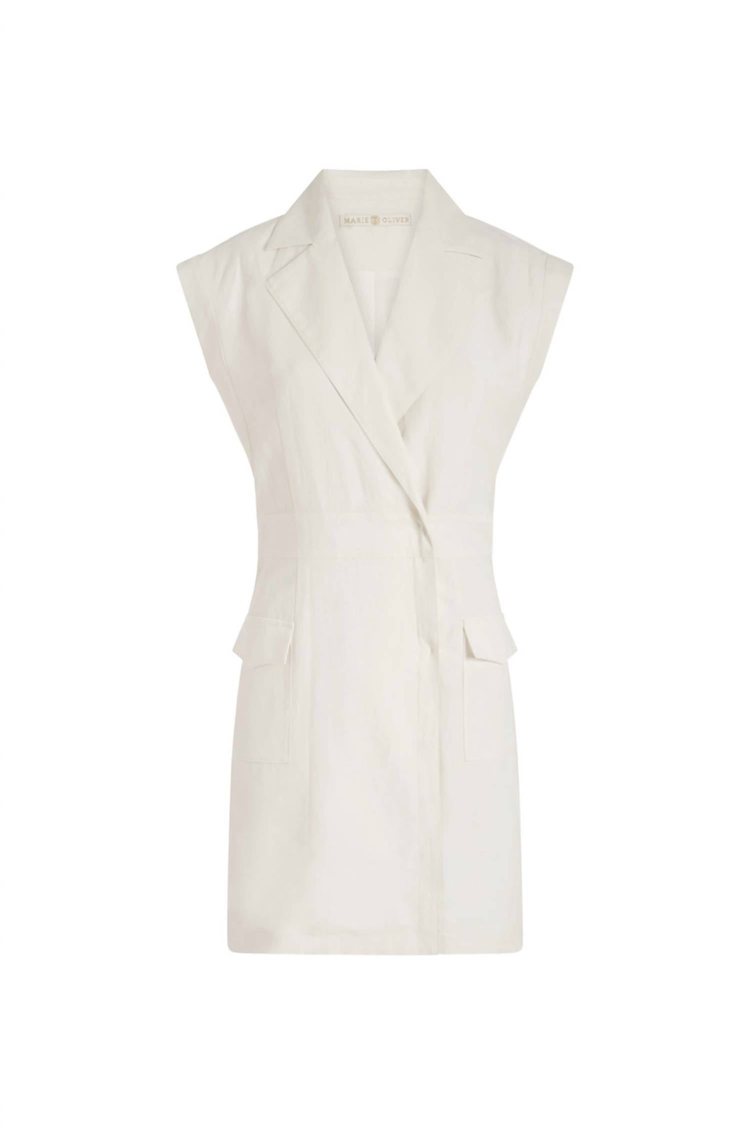 A sophisticated sleeveless mini dress crafted from a luxurious blend of 29% silk, 29% cotton, and 42% linen, this structured piece exudes a polished military-inspired look with sharp lapels and convenient pocket detailing. The dress features a double-breasted style with a concealed button and snap closure, offering a tailored yet feminine silhouette. Care is a breeze with machine wash on a gentle cycle and laying flat to dry.