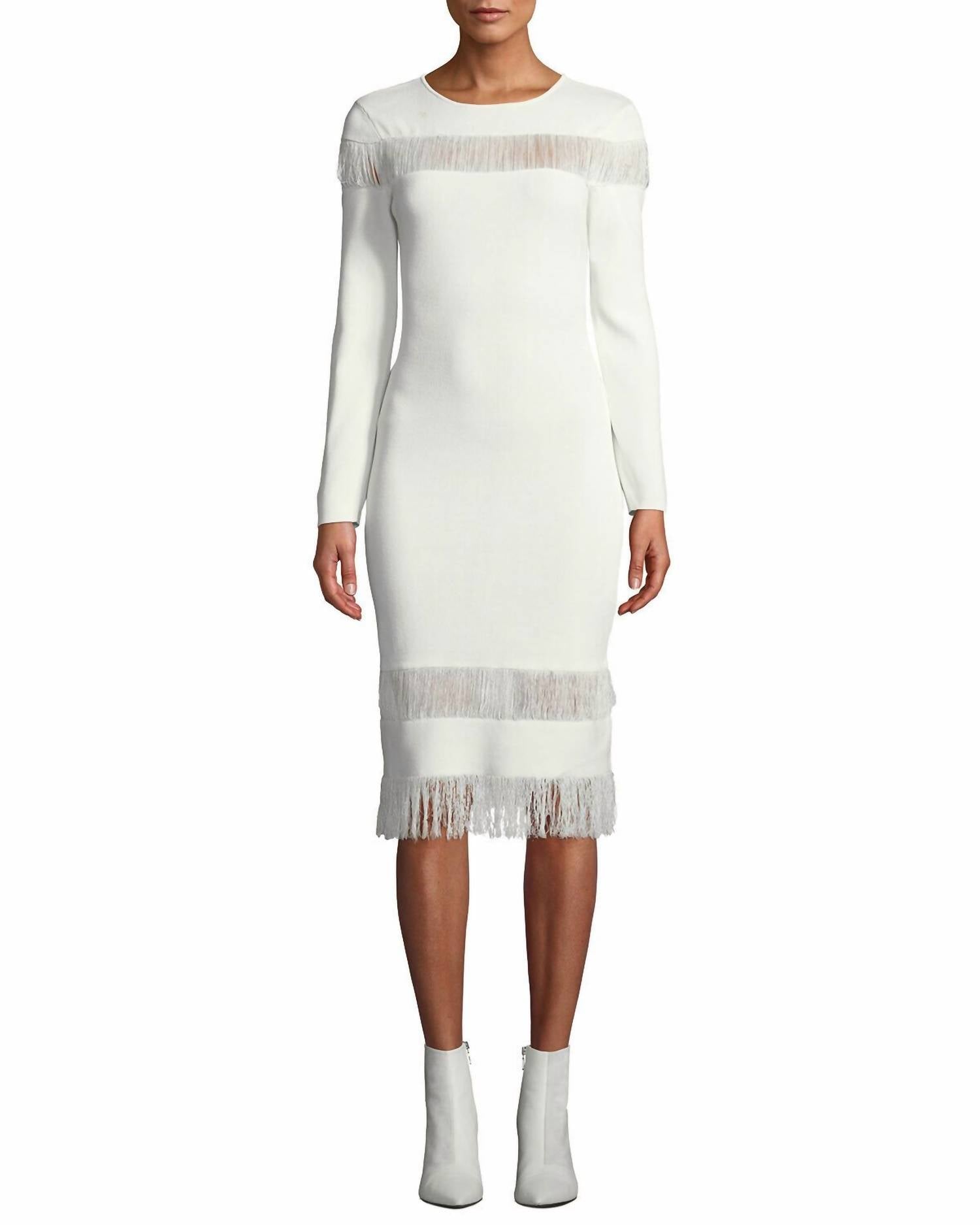 Cute and comfortable, this long sleeve dress has it all. Unveil your inner elegance with the Seraphina Fringe Knit Long Sleeve Dress by SACHIN & BABI in a pristine white hue. This sheath dress boasts long bracelet sleeves and sheer fringe details that elegantly sweep across the chest and skirt, offering a hint of intrigue without being too revealing. Made from a mid-weight knit blend of 63% Rayon and 37% Nylon, it measures 42" in length from shoulder to hem, providing a sophisticated silhouette. This piece features a classic crewneck and a convenient zip closure at the back, and it's perfect for both day and night when dry cleaned. Measurements include a shoulder width of 17.5", chest of 17", waist of 14.5", hips of 18.25", and sleeves extending 23".