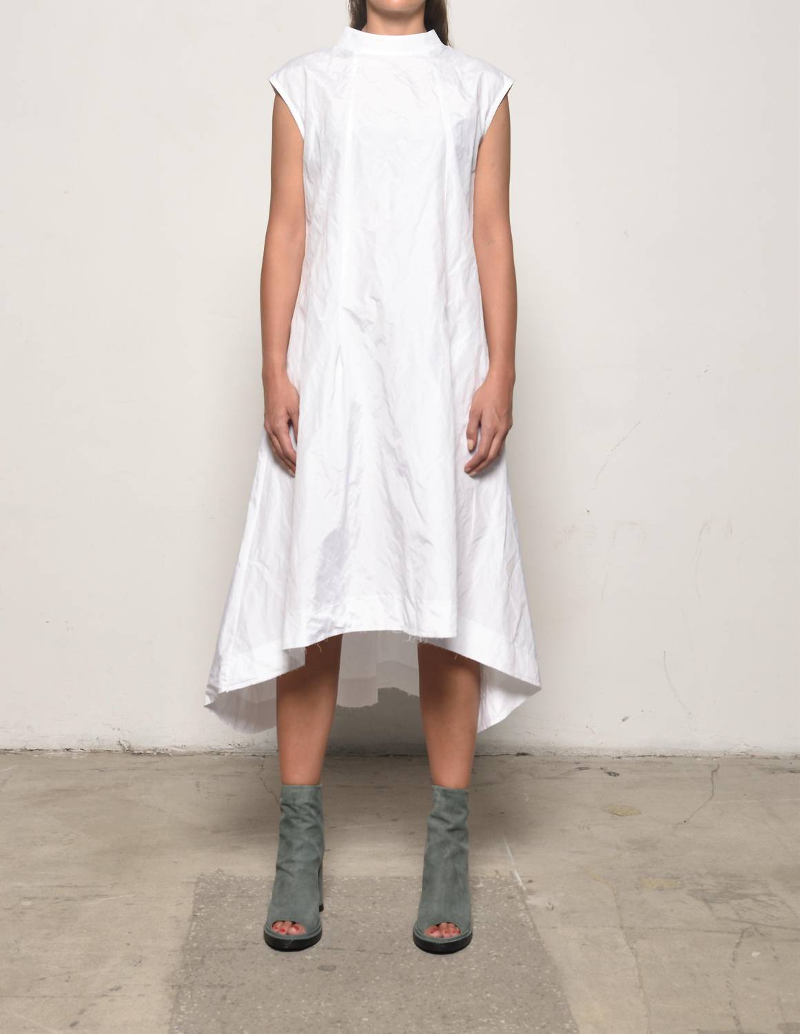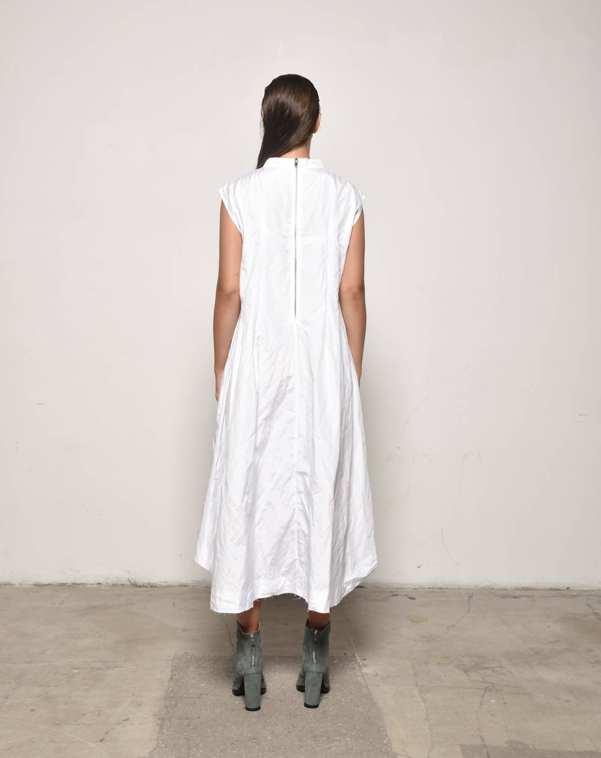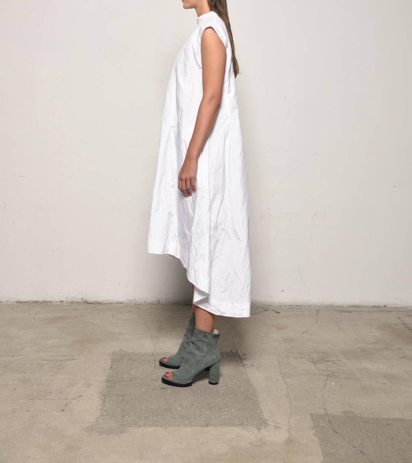 Meet the Gaia Sleeveless Dress by Simply Mila, an exquisite choice for both everyday elegance and evening glamour. This white, sleeveless maxi dress features a chic high neck and a sophisticated high-low hem. The dress is tailored with seam lines for an elongating effect and has convenient pockets, making it as functional as it is fashionable. Made in the USA, it closes with a back zipper. Size XS has a bust measurement of 34 3/4", waist 36", hip 44", front length 40", and back length 50", highlighting its perfect design for summer occasions.