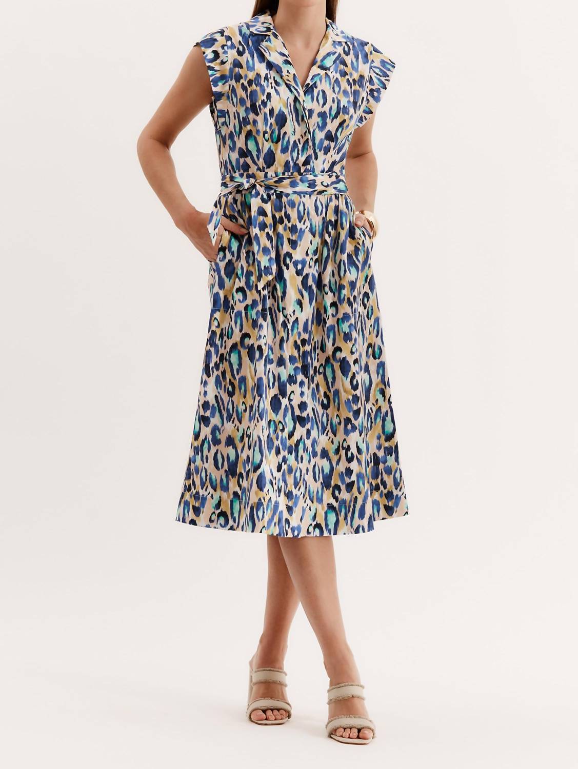 A midi dress so versatile, your options for wearing it are endless. Discover the Paige Dress by Tyler Boe, showcasing cap sleeves and crafted from 100% cotton for a breathable fit. This midi-length dress in the exclusive Aqua Animal print features a chic front wrap with ties and side seam pockets, enhancing both style and functionality. Made in China, it presents an elegant notch collar and A-line silhouette perfect for warm weather occasions. Care: Machine wash cold and line dry. Length: 48". The model, standing at 5’9”, is wearing a size S.