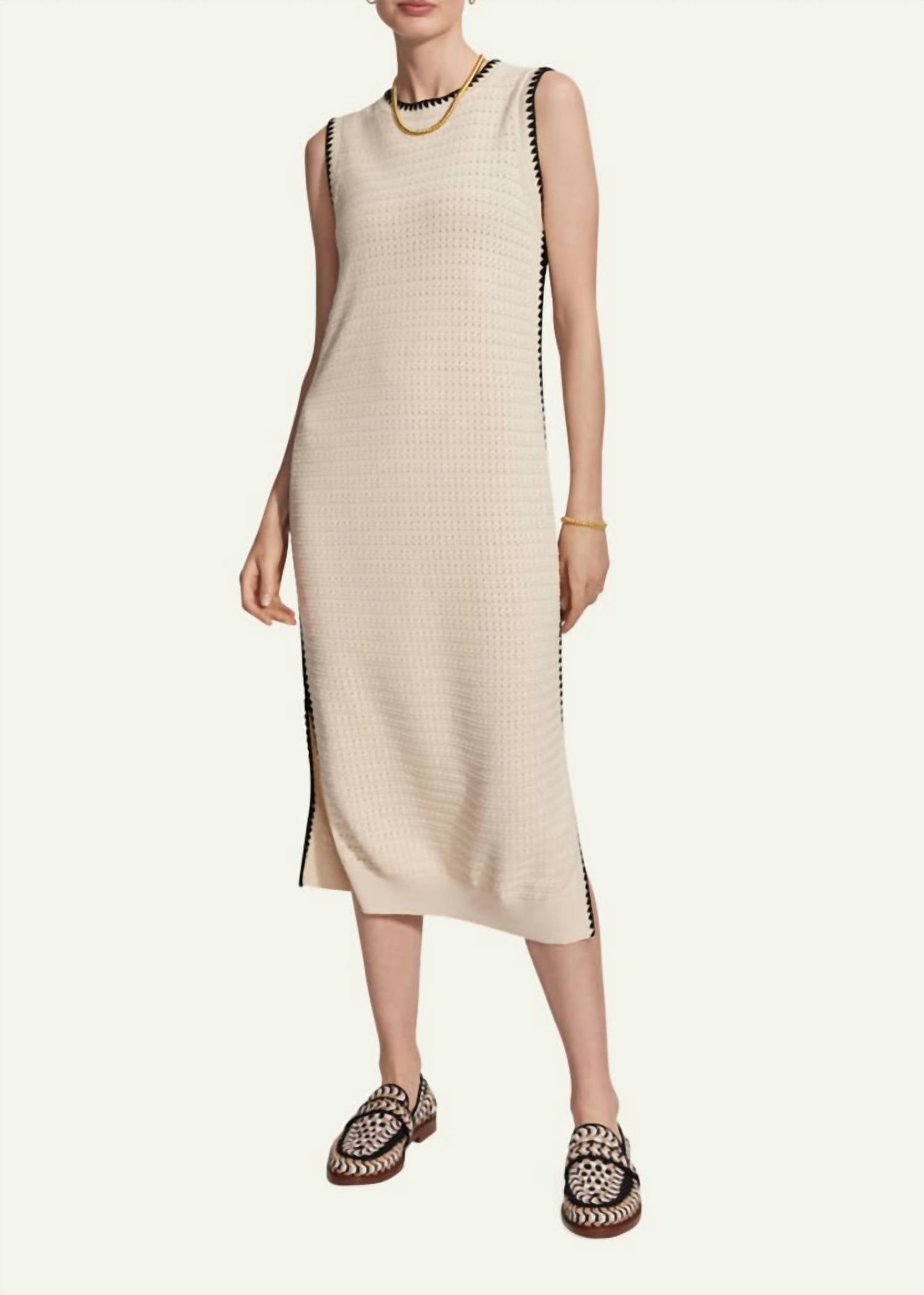 Meet the Dwight Tank Dress by VARLEY, a stylish choice for spring vacations with its modern midi length and short sleeves. Crafted from 100% cotton, this textured, pull-on dress features a crewneck and showcases contrasting scalloped edging for a chic detail. Ideal for pairing with sandals, it comes in a calming birch color with black edging, perfect for both beach days and evenings out. Care instructions include machine washing on a cool setting, ironing on low, and laying flat to dry.