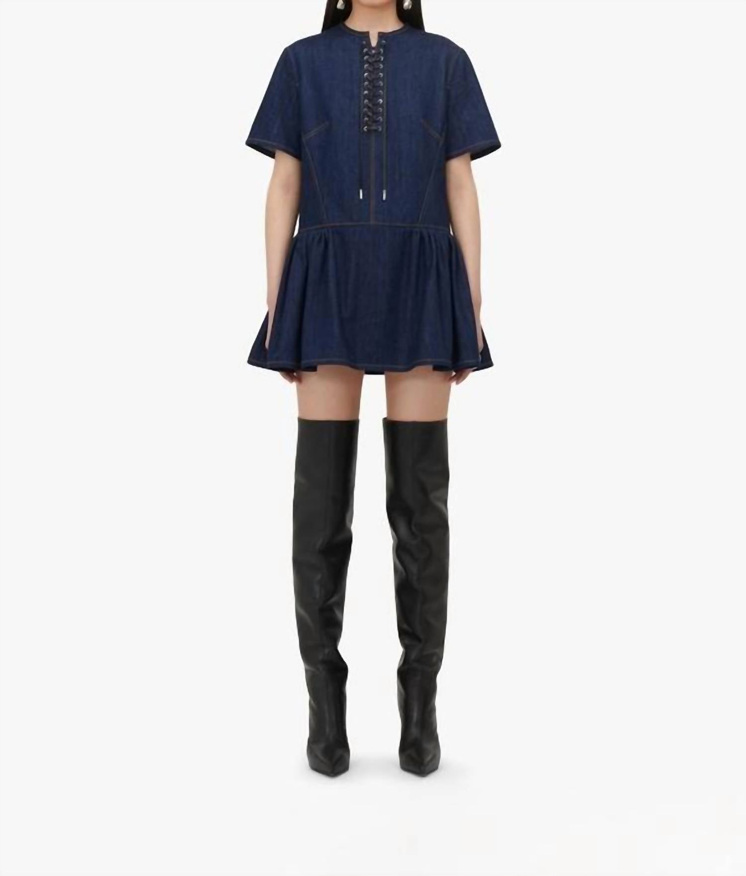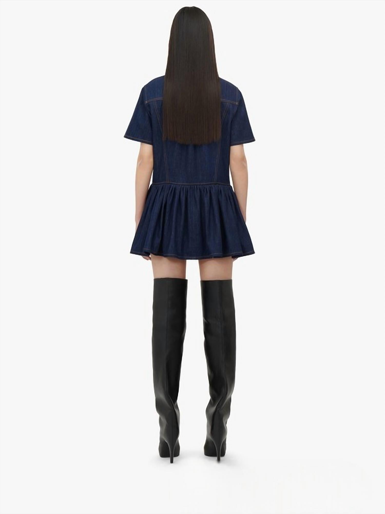 Elevate your wardrobe with the Tiered Lace-up Topstitched Denim Dress by Alexander McQueen, a dark cold wash mini masterpiece crafted for an effortlessly chic appearance. Designed with a slightly loose fit, this shift dress features short sleeves and a crewneck. Made in Italy, it combines 100% cotton denim with a leather trim and a polyester-cotton lining for a luxurious feel. The dress is finished with a button-fastening keyhole at the back for a sophisticated touch.