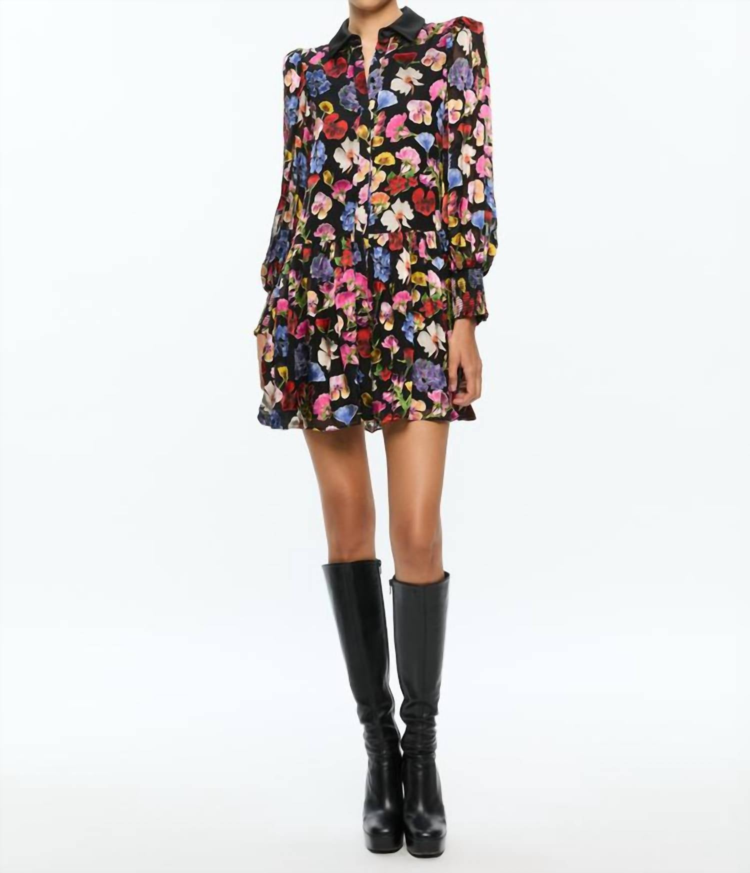 A short and breezy dress for those warmer days. The Bertha Mini Shirt Dress by Alice + Olivia is a delightful addition to your summer wardrobe. Featuring a chic floral pattern in Timeless Blossom, this dress comes with short sleeves and a classic collar, perfect for any evening event. Crafted from a luxurious viscose blend, it boasts a minimalist silhouette, courtesy of its button closure. For optimal care, ensure it's dry cleaned to maintain its vibrant design and quality.