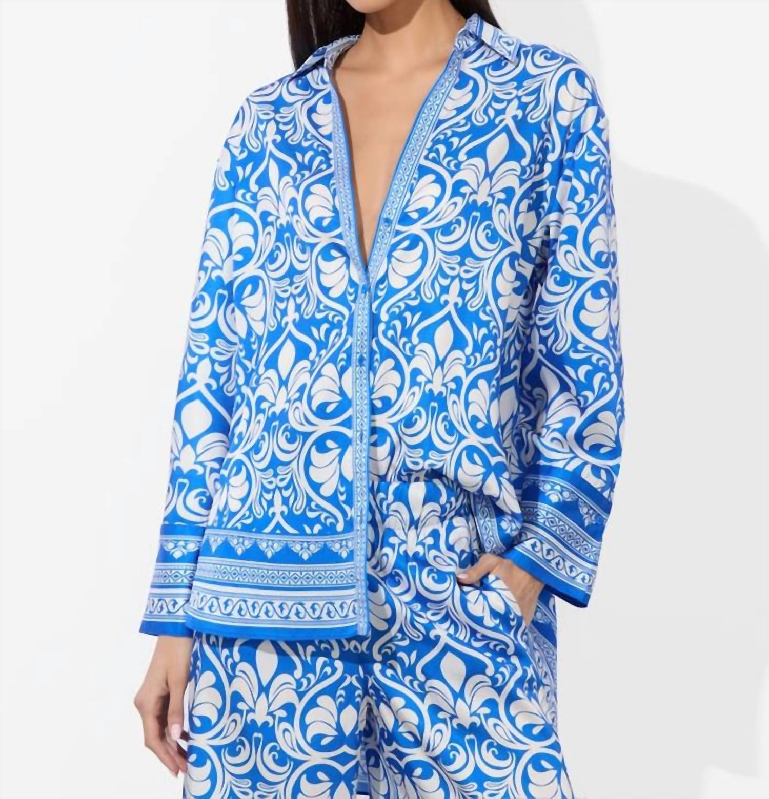 Pair with cozy slippers for pajama perfection. Introducing the Kiva Oversized Pajama Shirt by Alice + Olivia, a stunning option in Soiree True Blue with a boho chic vibe ideal for spring. This long-sleeve shirt features a classic collar and a beautiful patterned design, crafted from comfortable 100% Polyester. Perfect for lounging in style, it embodies the blend of elegance and relaxation. Care: Dry clean only.
