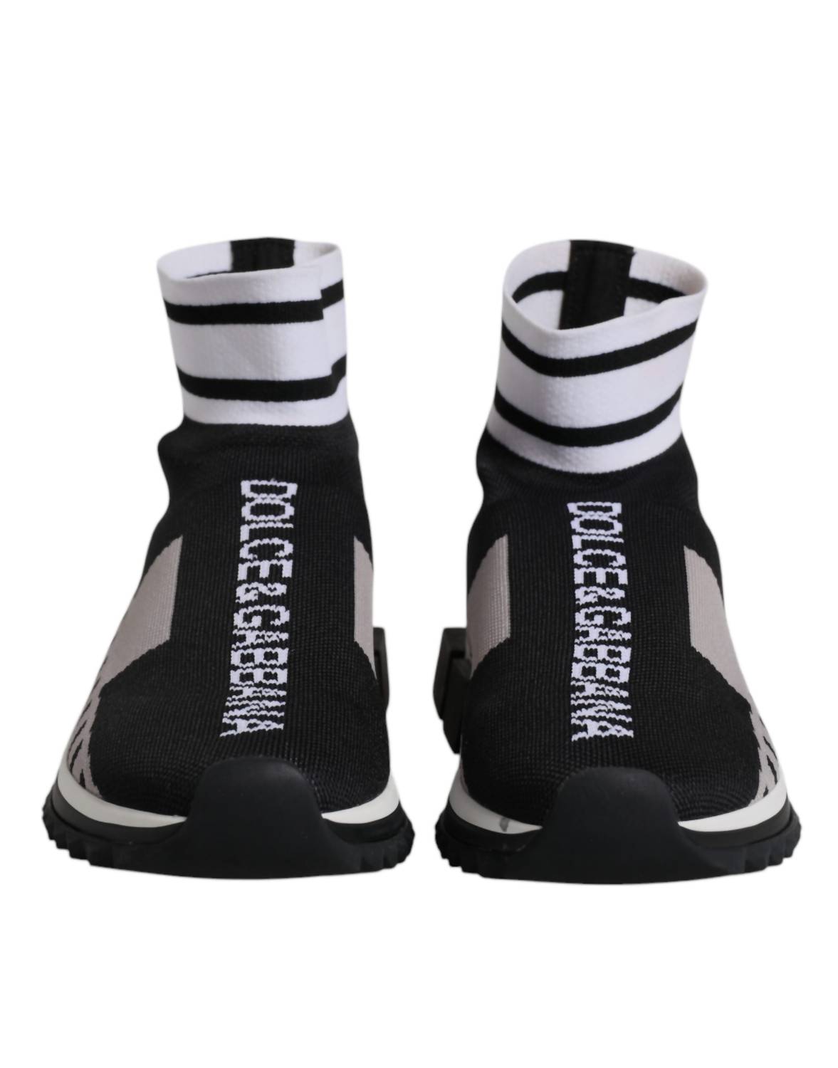 When fashion and function come together seamlessly. Introducing the Dolce & Gabbana Sorrento Slip-On Sneakers, a luxurious blend of craftsmanship and style. These women's sneakers are made in Italy from 80% polyester and 20% viscose, featuring a round toe and a convenient slip-on style with a pull tab at the rear. The ridged rubber sole provides comfort and grip, enhanced with stylish logo details. Perfect for an athleisure look, these sneakers come in an elegant black and gray, ideal for fitness workouts and summer occasions.