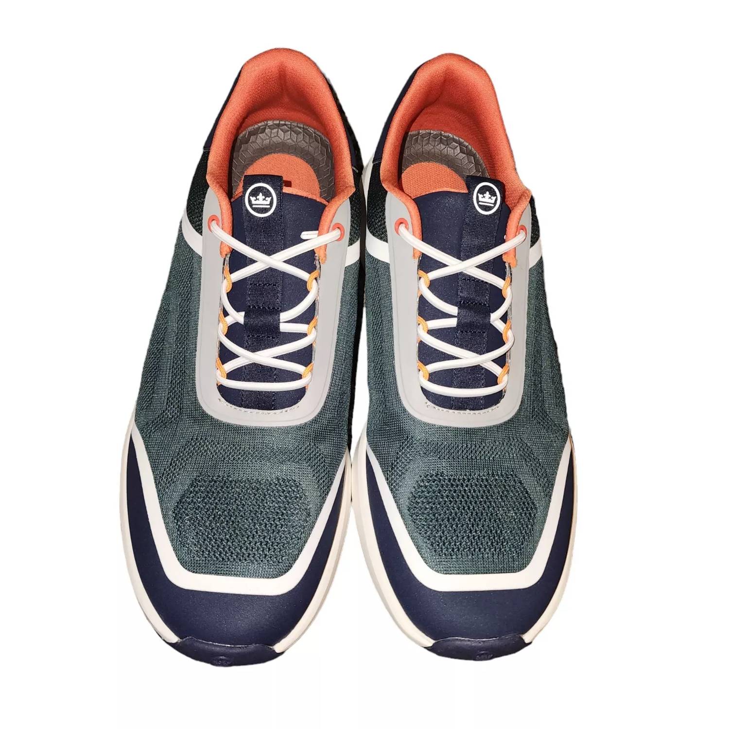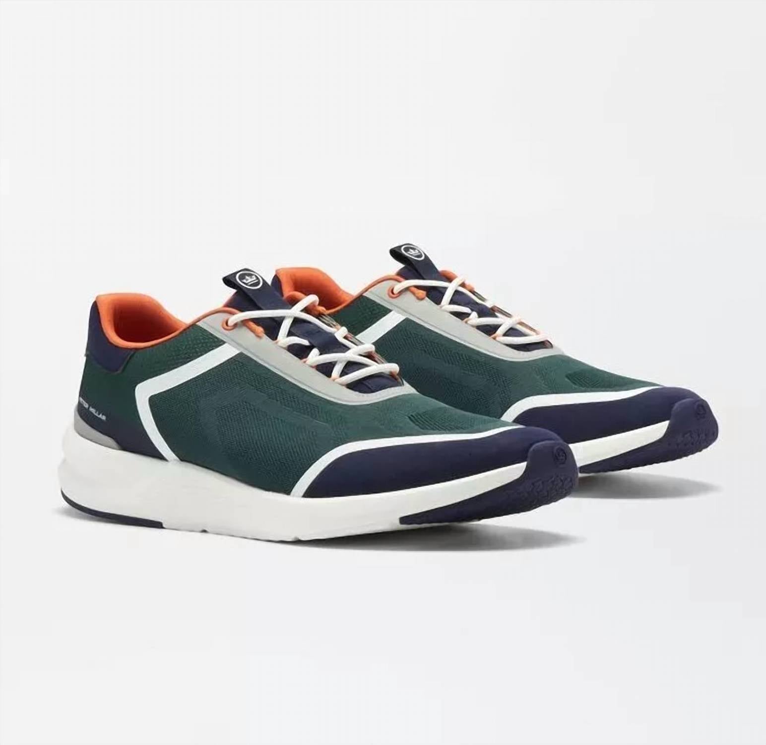 Introducing the Men's Camberfly Sneaker by PETER MILLAR, a remarkable fusion of technical performance and sleek athletic style in a striking Balsam hue. Designed with a round toe, these sneakers boast textured mesh uppers for exceptional breathability, and an ergonomic outsole shaped like an arc to support natural movement for superior comfort. The interior foam heel cup adds soft cushioning, while hexagonal pads on the sole ensure reliable traction. Elastic laces provide signature slip-on ease, making this innovative silhouette an essential addition to any wardrobe.