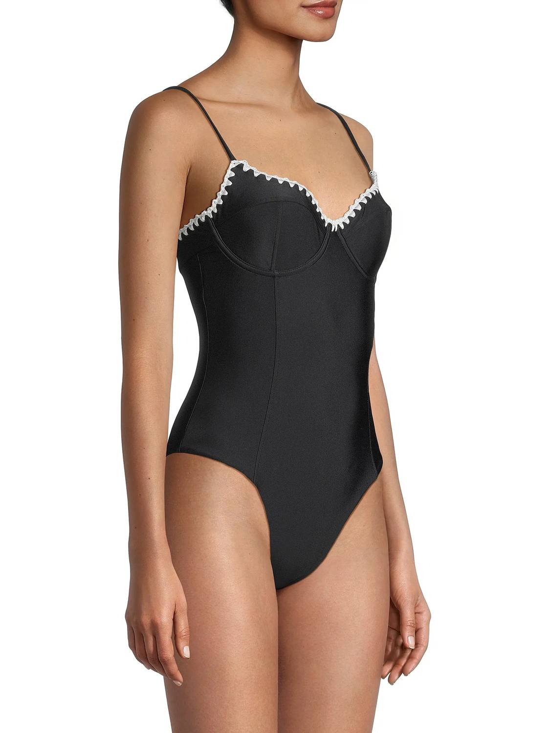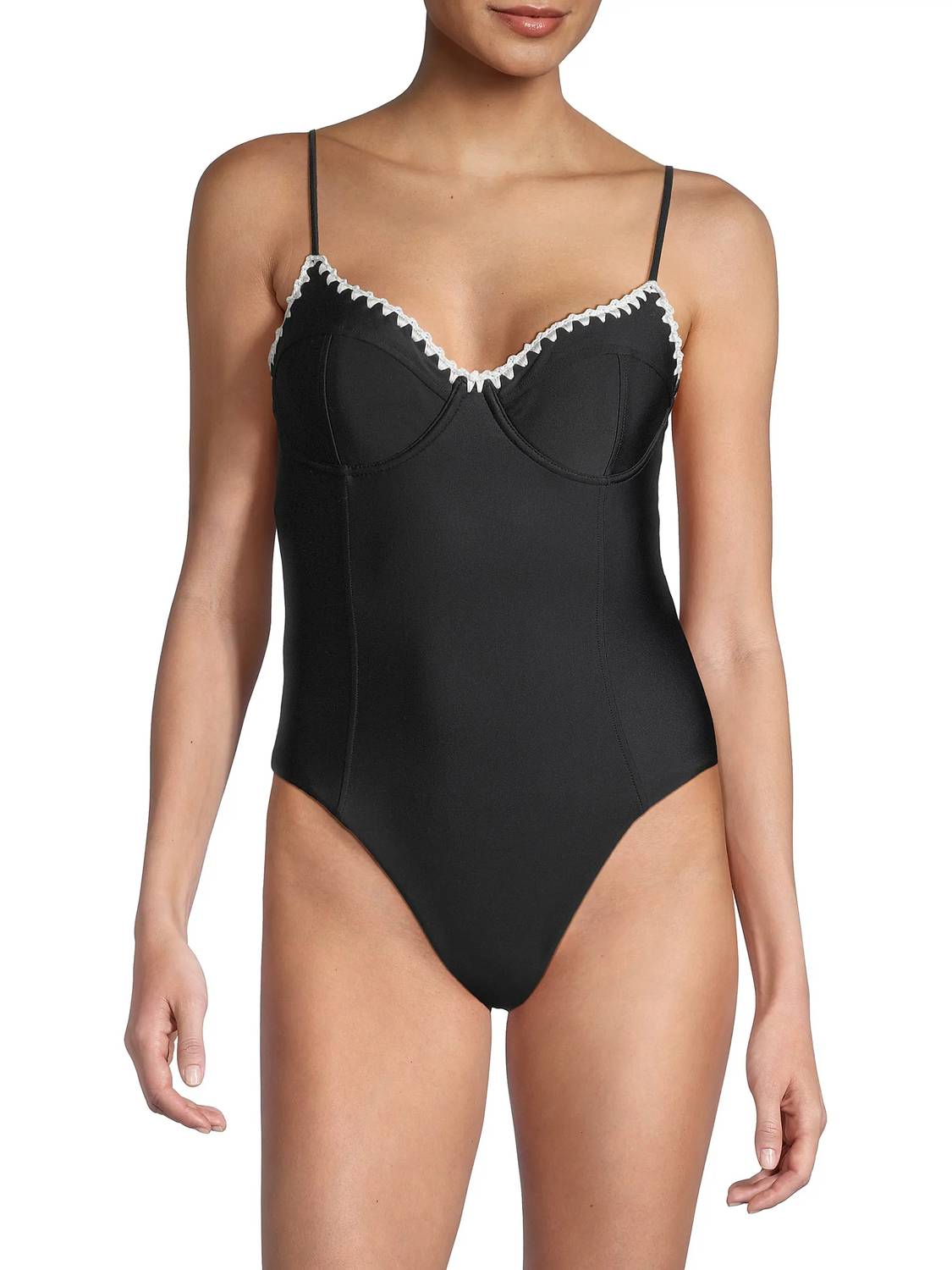 This one piece fits like a glove and covers all the right areas. The Addisyn One Piece Swimsuit by Ramy Brook is your go-to swimwear for a chic beach day. It features adjustable straps and full coverage underwire cups with contrasting whipstitch trim, designed for medium coverage. Made from a comfortable nylon blend with a lining composed of 92% polyester and 8% spandex, this swimsuit pulls on effortlessly. Care for it by hand washing and line drying to maintain its sleek black silhouette and lasting quality.