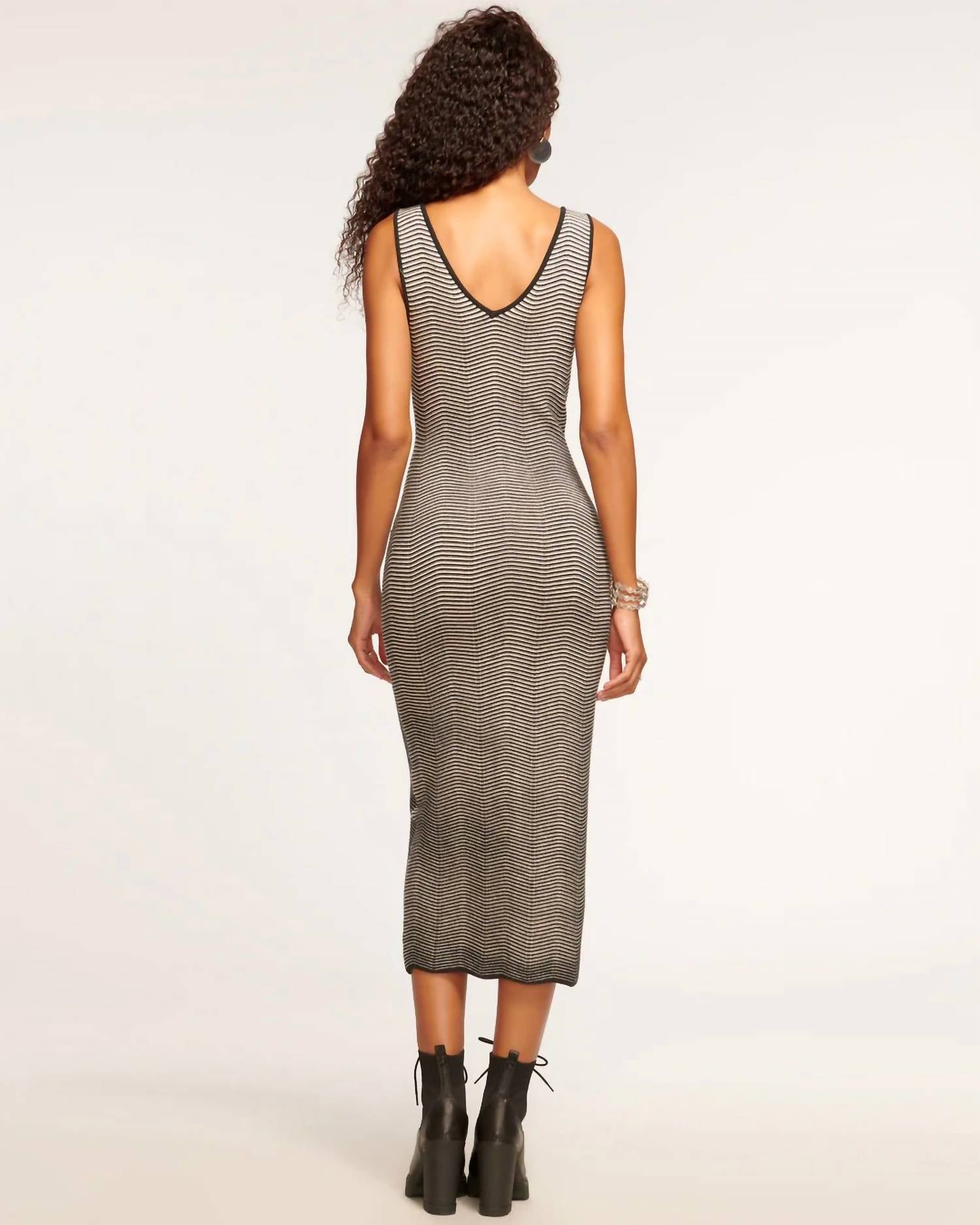 A midi dress so versatile, your options for wearing it are endless. The Adeline Bodycon Midi Dress by Ramy Brook is a sultry and stylish piece designed to showcase your curves. This sleeveless midi dress features a V-neckline and eye-catching black and white stripes in a striking knit fabric. Garment Length: Mid-length. Closure: Zip closure.