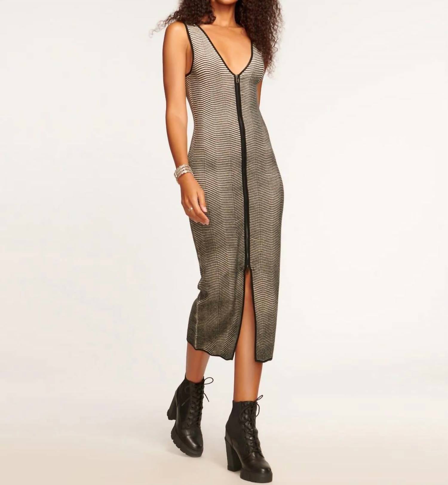 The Adeline Bodycon Midi Dress by Ramy Brook is a sultry and stylish piece designed to showcase your curves. This sleeveless midi dress features a V-neckline and eye-catching black and white stripes in a striking knit fabric. Garment Length: Mid-length. Closure: Zip closure.