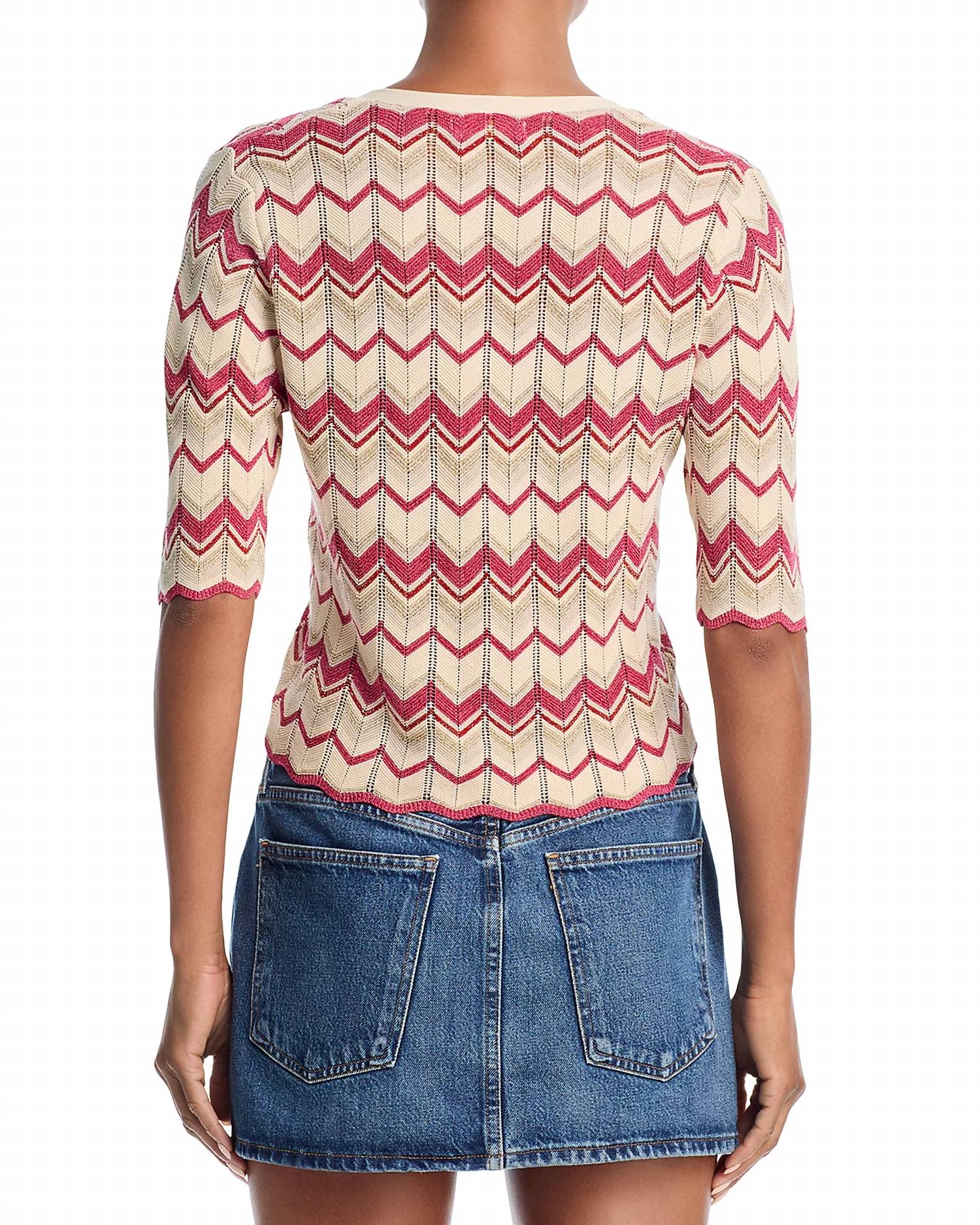 A classic fit that works just as good buttoned as it does left open. This short-sleeve top features a flattering V-neckline and front button closures. Designed with an allover knit chevron stripe pattern, it offers a textured look with a touch of retro charm. Imported.