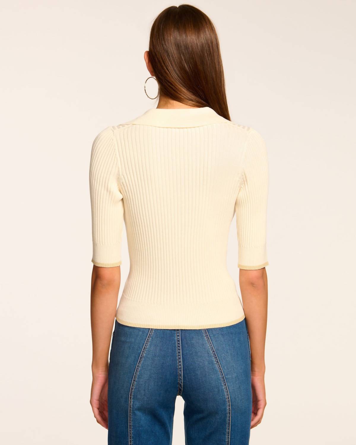 Wear this v-neck sweater with your favorite denim for the perfect fall look. The Kelly Ribbed Short Sleeve Sweater by Ramy Brook is a chic addition to your wardrobe, offering both versatility and a touch of elegance in ivory. Crafted from a textured viscose blend, this slightly short silhouette features a metallic trim V-neck with a collar, perfect for pairing with high-waisted pieces. With a pull-on closure, this fitted rib-knit design is a stylish choice for workwear or travel. Care for this garment with dry cleaning to maintain its sophisticated look.