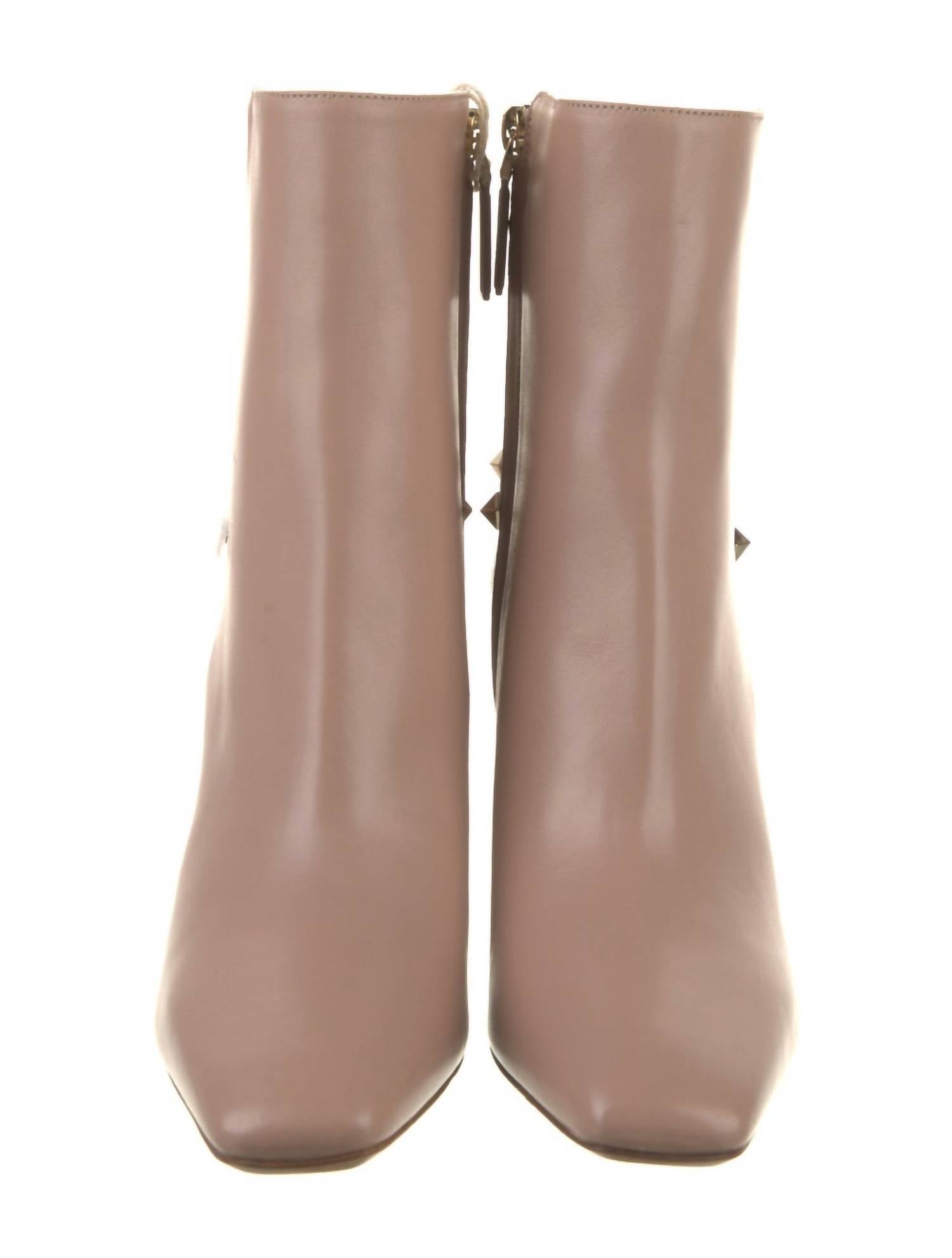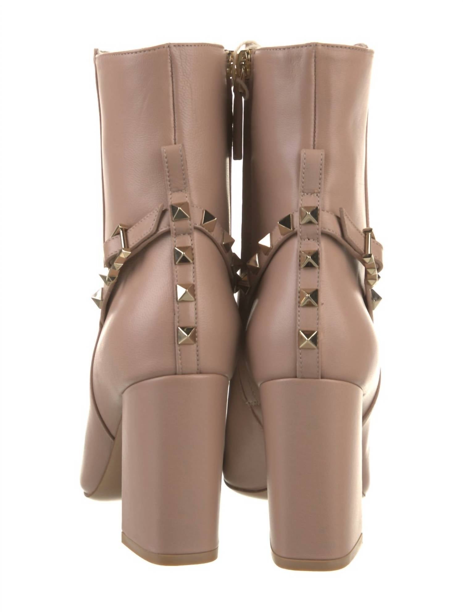 A stylish boot with a comfortable fit and the perfect amount of height. These classic boots are the perfect addition to any outfit and can be worn season after season. Elevate your style with the Women's Rockstud Leather Boots by Valentino Garavani, crafted in Italy in a sophisticated Rose Cannelle shade. These boots feature a squared toe and a high 3.5" block heel, perfectly designed for making a statement at music festivals. Made from 100% Nappa leather, they include a side zip fastening and decorative buckle detail, along with a practical pull-tab at the heel.