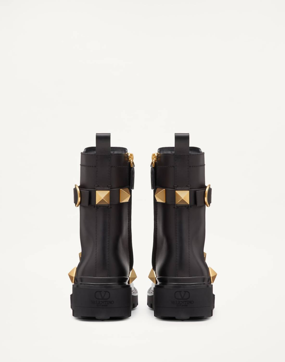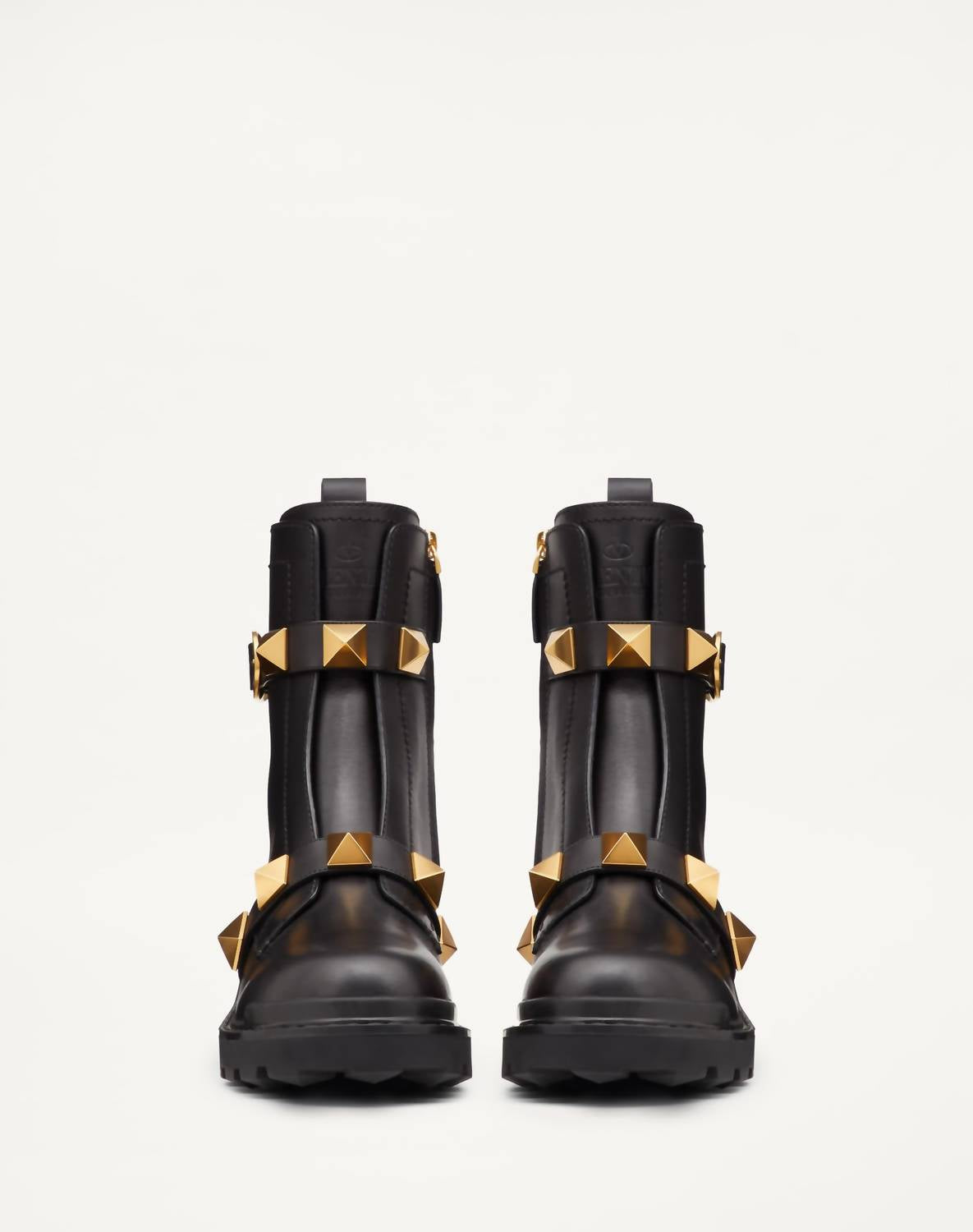 Introducing the Valentino Garavani Women's Roman Stud Combat Boots in timeless black, crafted for bold sophistication. Made from luxurious calfskin, these boots feature striking 18x18 mm maxi studs with an antique-brass finish. The rubber sole is designed with maxi stud relief, paired with a side zipper fastening and a strap with an eye-catching maxi buckle. Heel height is 40 mm/1.6 inches, and these exquisite boots are proudly made in Italy.