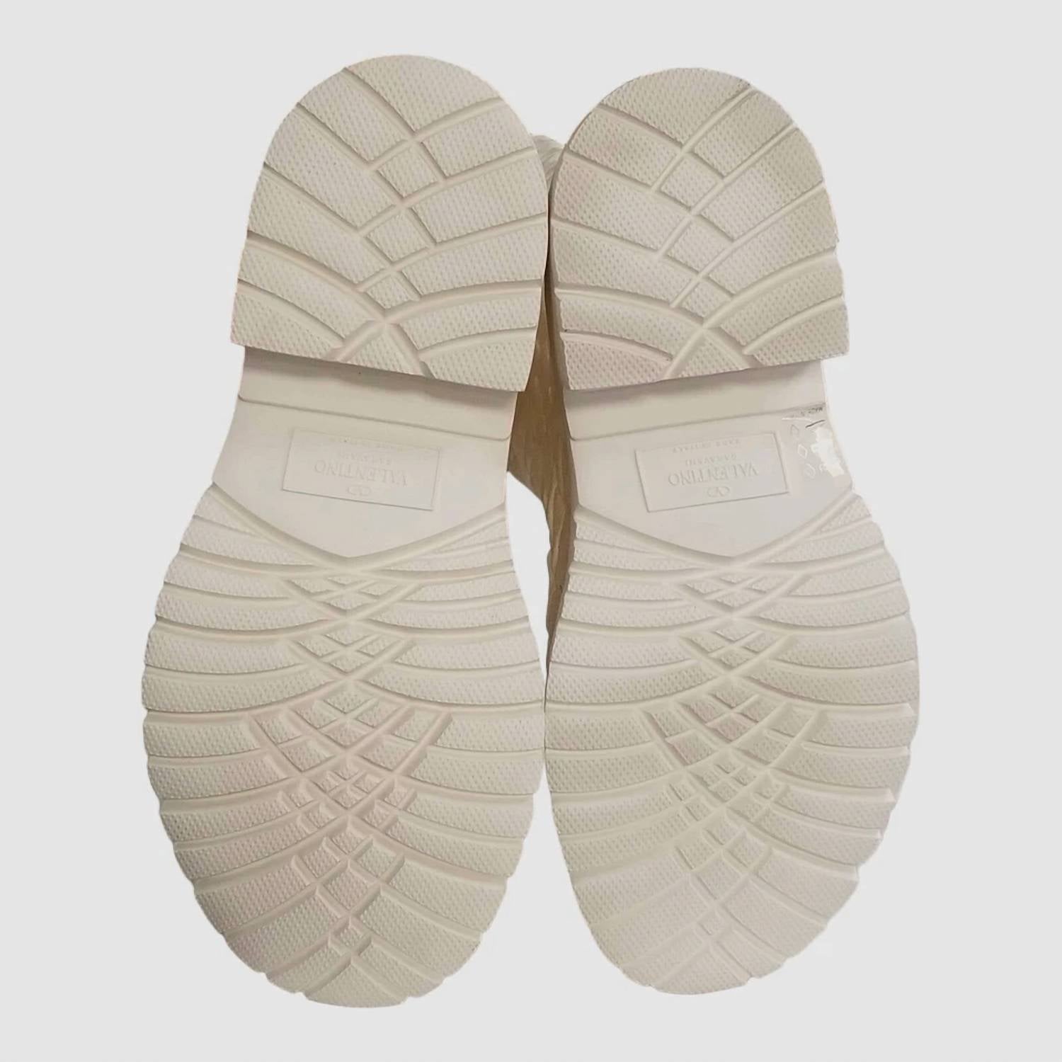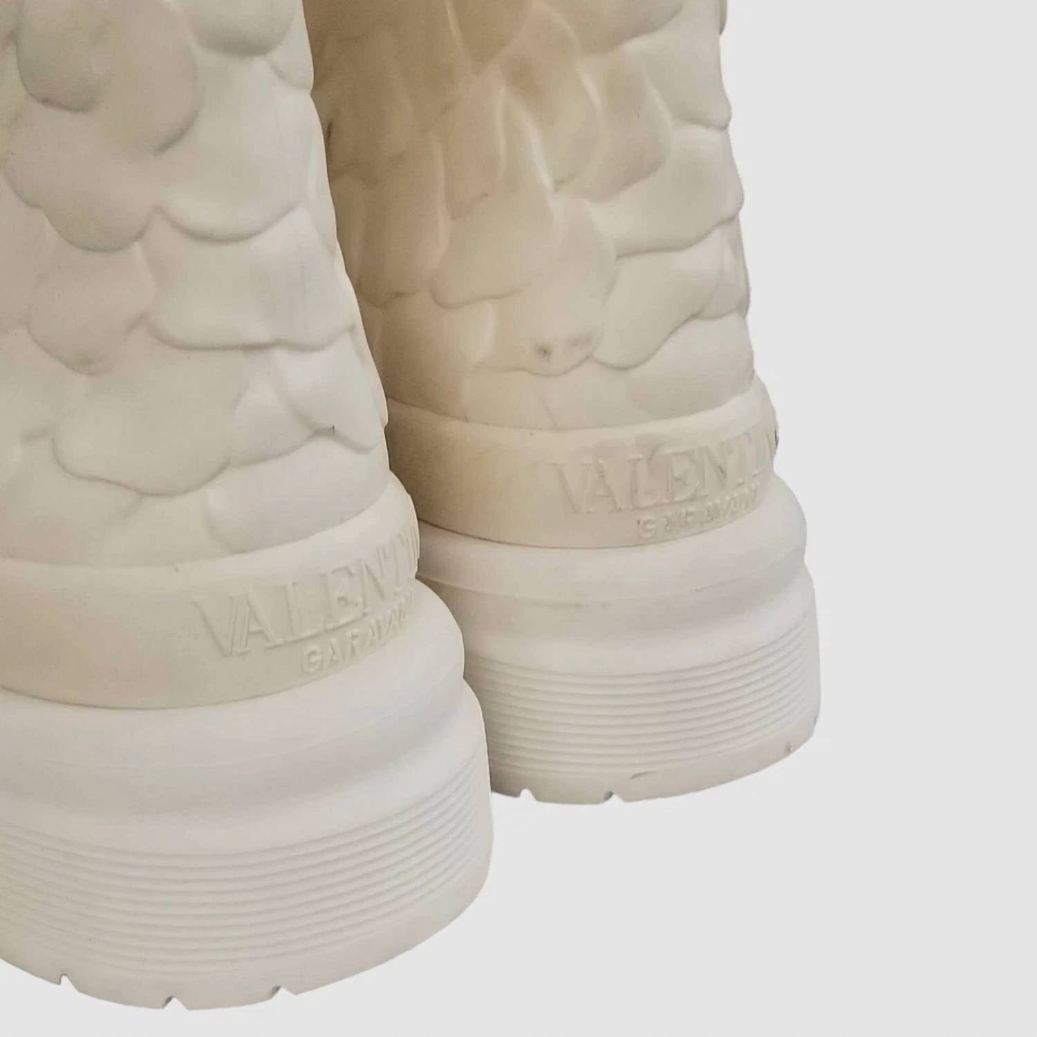 These over the knee boots are equal parts classic and cool. Experience the elegance of Valentino Garavani with the Women's Rubber Rose Edition Atelier Knee Hi Boots in ivory. These Italian-made over-the-knee boots feature a polyvinyl chloride upper and a durable rubber exterior material, complemented by a calf leather lining and fabric insole for luxurious comfort. The pull-on style and round toe design offer a blend of style and ease, sitting atop a sophisticated 2-inch block heel. A plastic sole ensures reliable traction, making them a chic yet practical choice for any fashionable wardrobe.