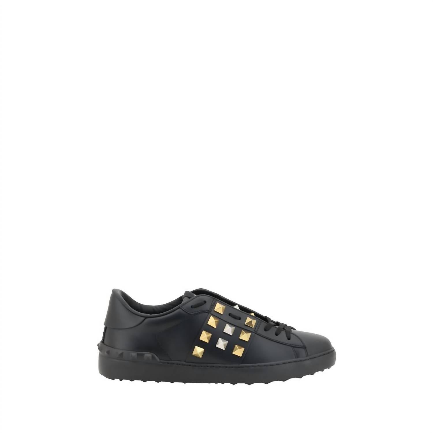 When fashion and function come together seamlessly. Step into luxury with Valentino Garavani's Women's Rockstud Sneakers in sleek black. Crafted from 100% Calf Leather, these Italian-made sneakers are a synonymous blend of style and function, perfect for evening events or adding a streetwear edge. The slip-on design features a classic round toe and distinctive Valentino branding, complete with iconic Rockstud detailing on the sides. Ideal for the fashion-forward woman, these flat sneakers epitomize sophisticated comfort.