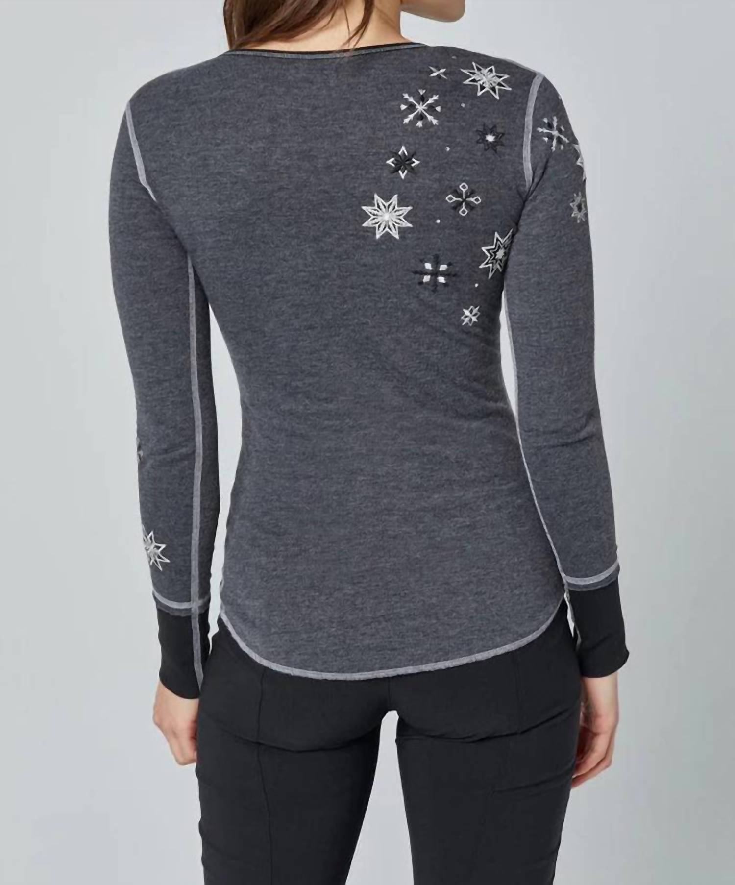 A long sleeve top you can wear with denim, skirts, well... just about anything! Embrace the chill in style in Heather Black essential for your holiday wardrobe. Crafted from a blend of 75% organic cotton and 25% recycled polyester. Featuring intricate snowflake embroidery for a touch of winter charm. Boasts a flattering V-neckline adorned with metal edelweiss flower button accents and ribbed knit cuffs for added texture. Designed with pull-on closure. Easy machine wash care. Fits true to size, with our model wearing size S at 5'9" height and measurements of 33" bust, 26" waist, and 36.5" hips.