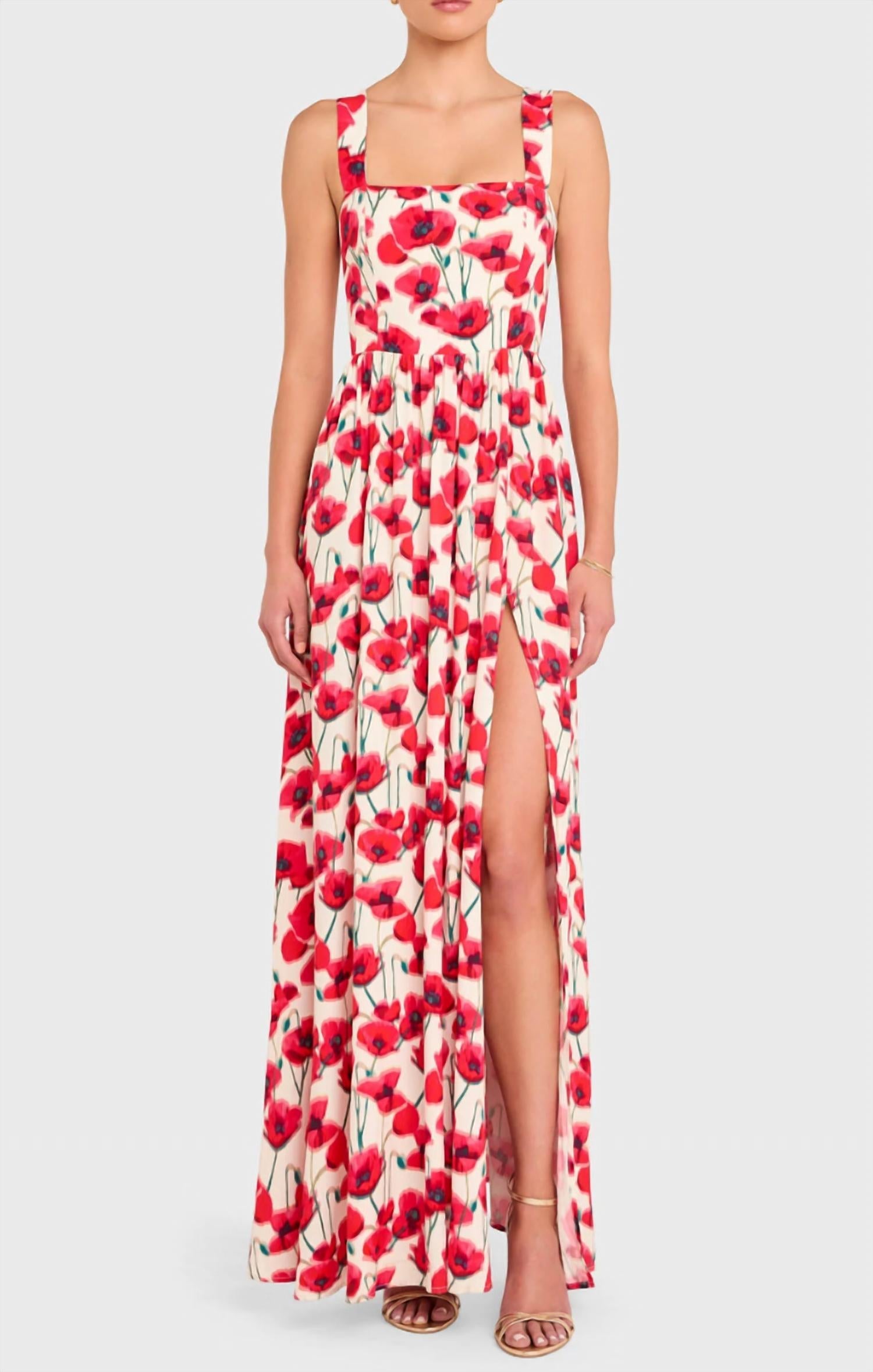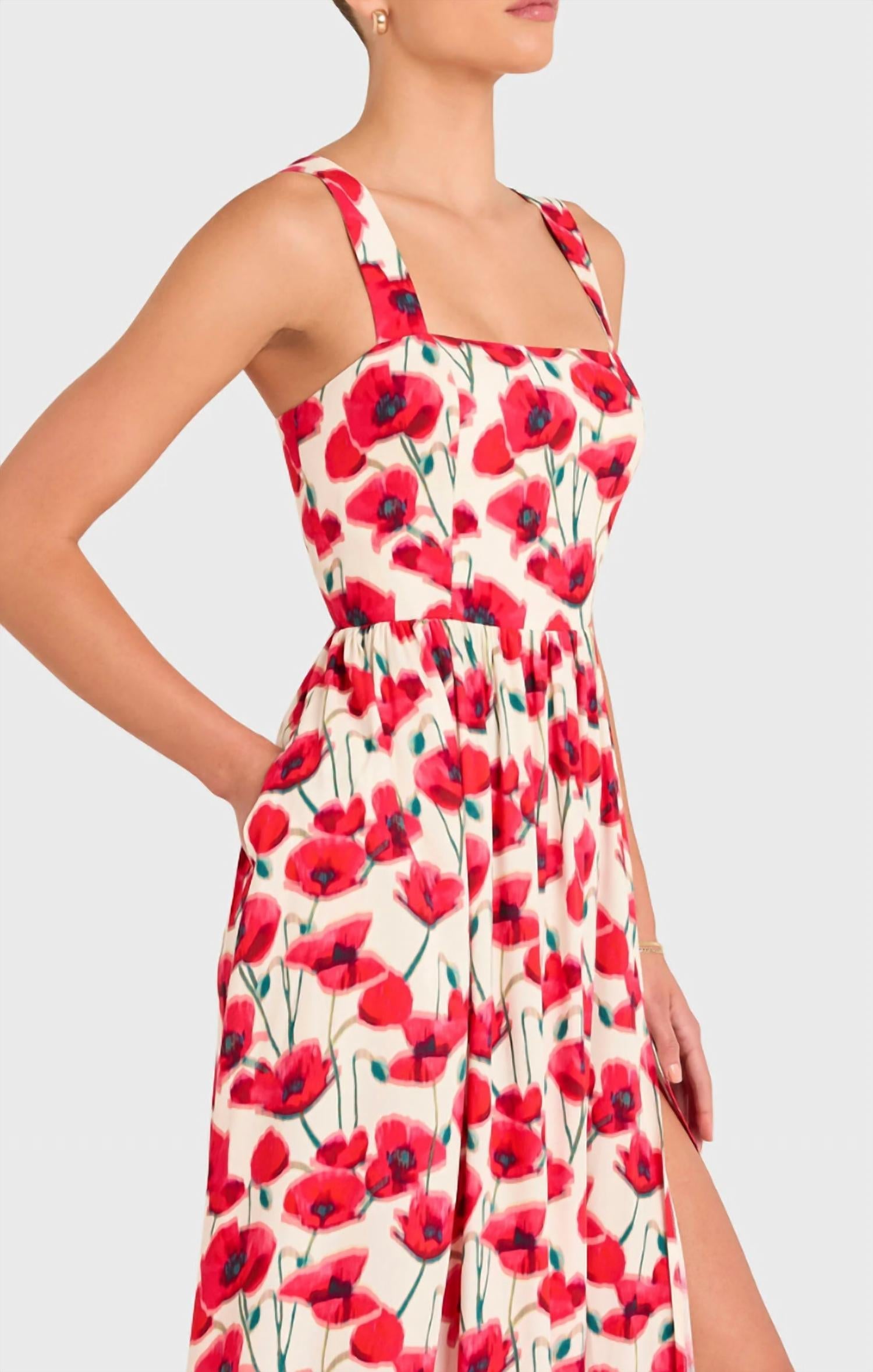 A maxi dress that is just as cute as it is comfortable. Step into summer elegance with the Amanda Uprichard Florence Maxi Dress, a must-have for any warm-weather occasion. This sleeveless A-line silhouette features a square neckline and wide straps for a flattering fit, complete with a fitted bodice and a flowy, loose skirt adorned in a poppy field floral print. Made from 100% Rayon, it boasts a high slit and is secured with an invisible zipper closure with hook and eye. Perfect for summer weddings or cocktail parties, this partially lined maxi is a statement piece for your boho chic wardrobe.
