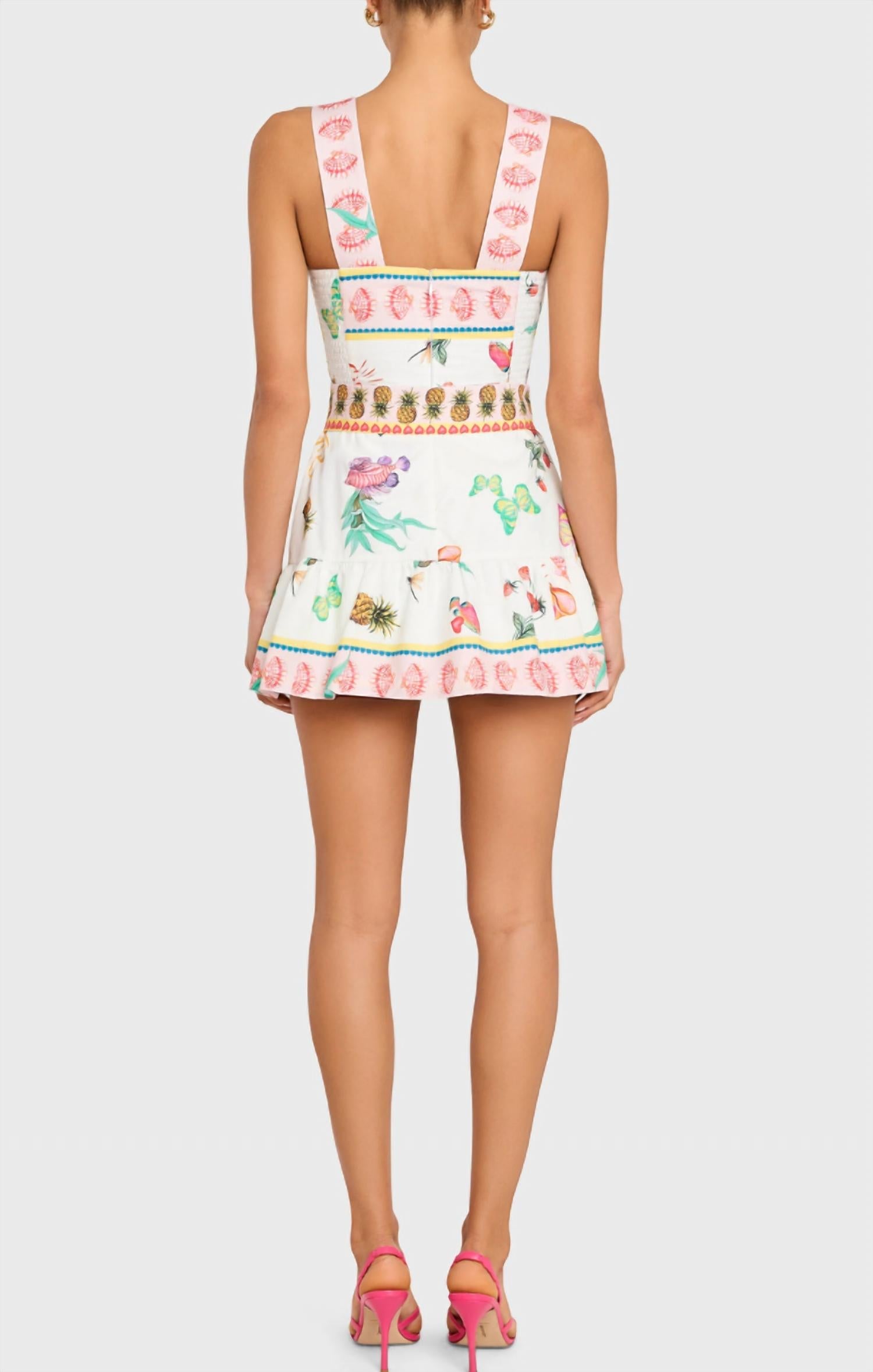 It doesn't take much for this one piece to look effortlessly cool. Add some statement jewelry to dress it up, or throw on some sneakers for a more casual vibe. Capture the essence of summer with the Lena Skort Romper by Amanda Uprichard, effortlessly blending chic style with comfort. This romper in a unique Postcard Print features thick straps and a square neckline, offering a boho-chic vibe perfect for beach days or Thanksgiving gatherings. Made from 100% cotton, it includes interior shorts and a self-covered belt. Closure: Zip closure.