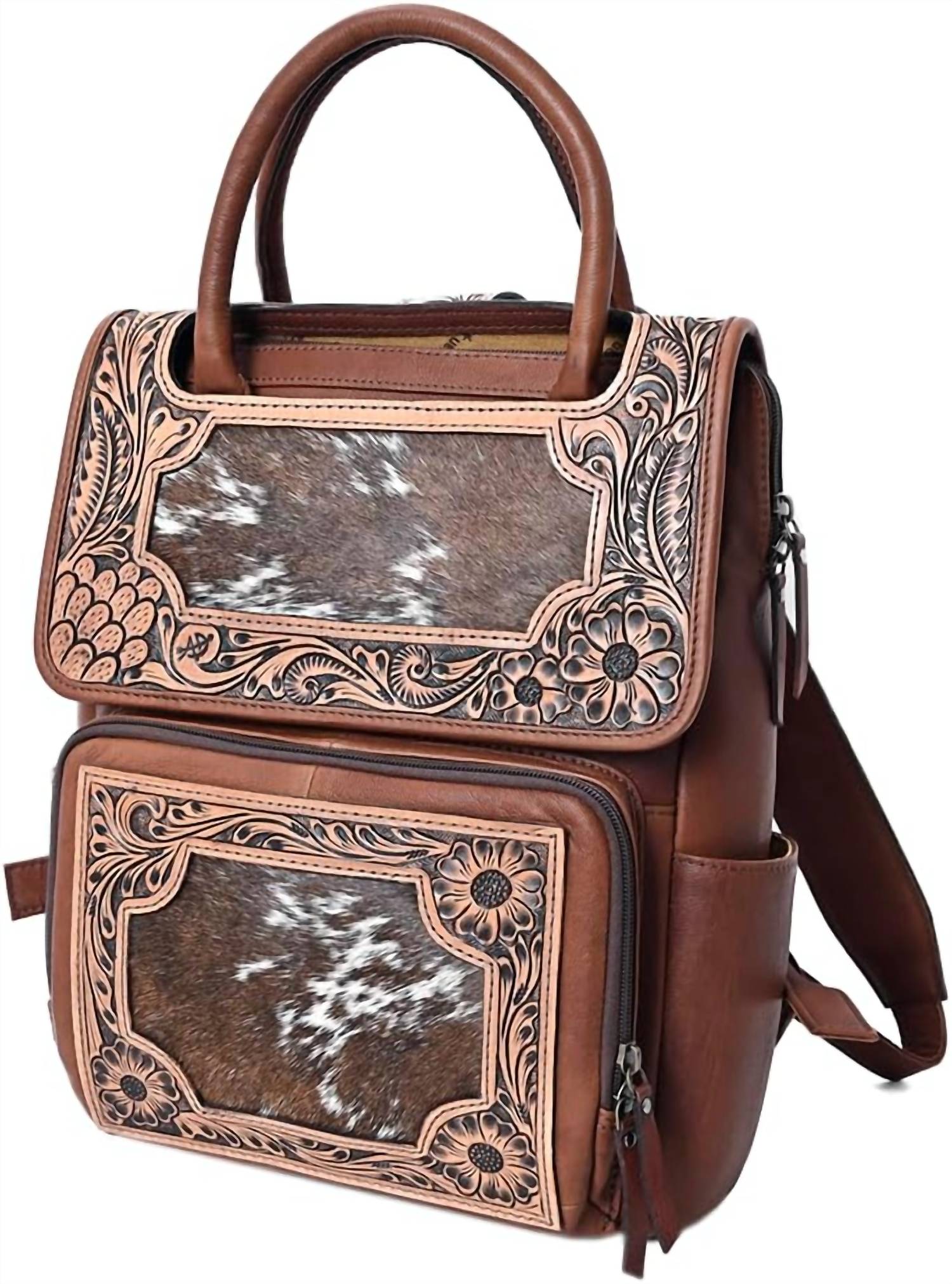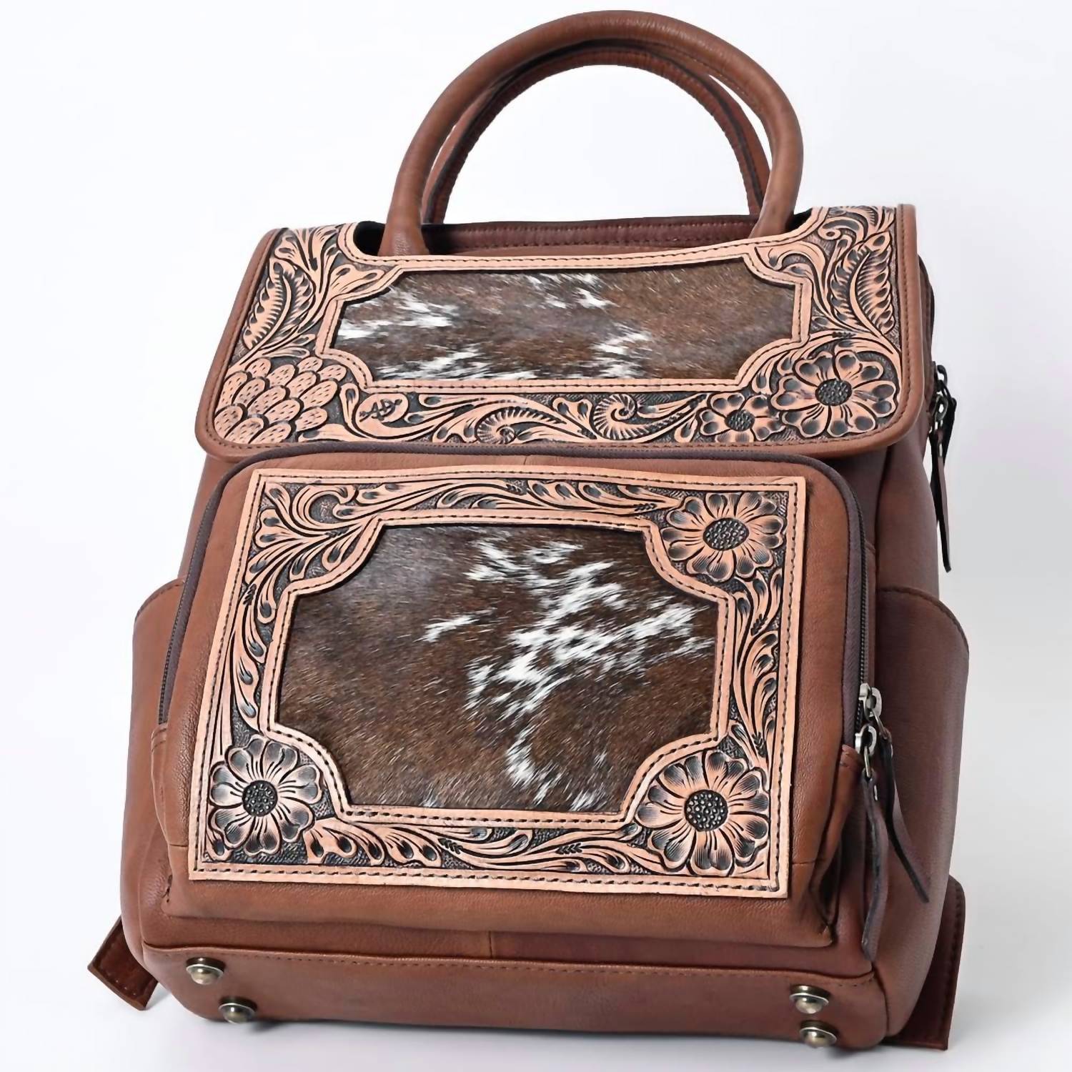 The perfect size backpack that fits everything you need! Discover the Women's Leather Hair On Hide Backpack by American Darling, a perfect blend of craftsmanship and style for every occasion. Made in the USA with premium quality, eco-friendly vegetable-tanned American Genuine Cowhide Leather, this brown backpack is both durable and elegant. Sized at 14" in height, 11" in width, and 4" in depth, it is ideal for outdoor events, travel, shopping, or daily use.