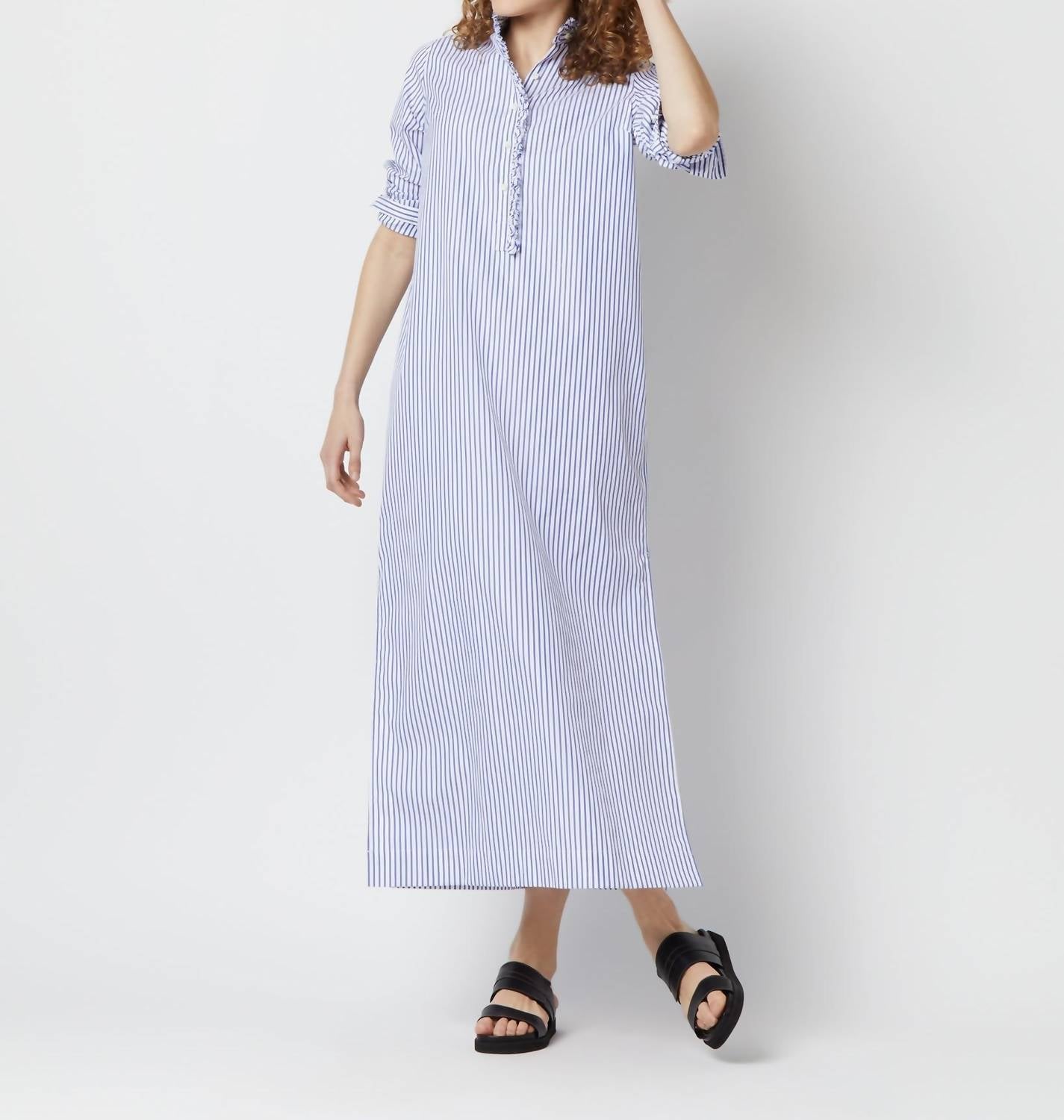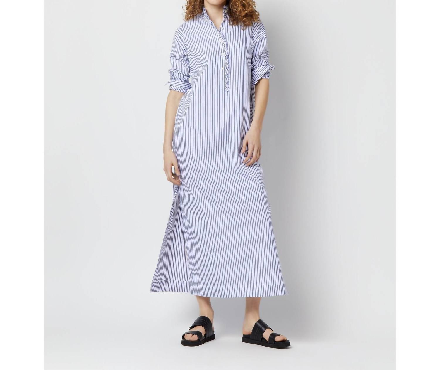 Who doesn't love a good maxi dress? This one you'll be reaching for season after season. Introducing the Frill Talitha Shirtdress by Ann Mashburn in a chic Blue/White Stripe Pinpoint pattern, perfect for your spring travels. This maxi shirtdress features long sleeves and is crafted from 100% crisp Italian pinpoint cotton, ensuring comfort and style. It includes a popover placket with 3.5mm Trocas shell buttons for classic closure, complemented by raw-edge frill detail at the mock neck. Made in Honduras with convenient side pockets, you can machine wash this dress cold and hang it to dry. Length adjustments up to 1.5" are possible, ensuring a tailored fit.
