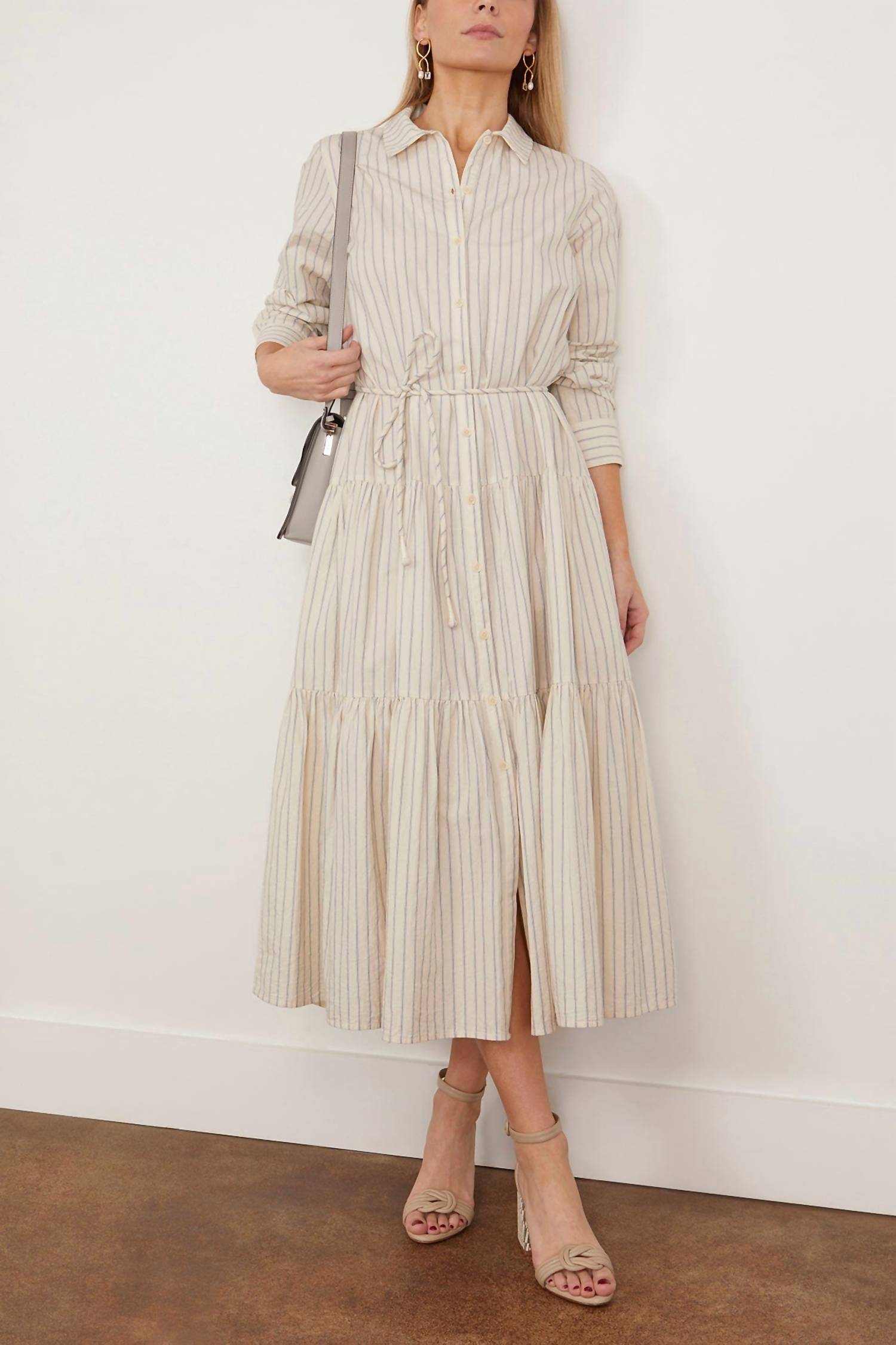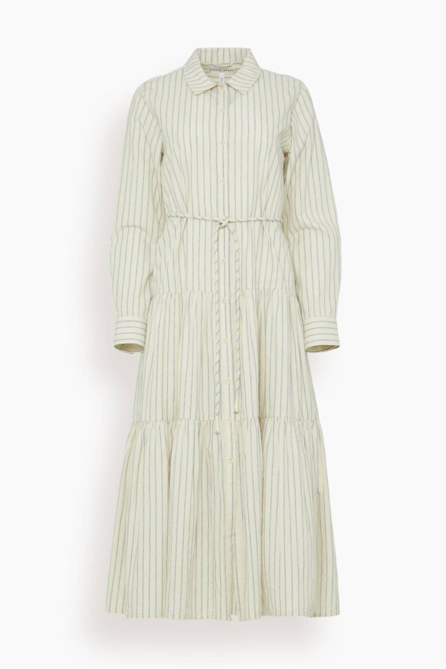 A midi dress so versatile, your options for wearing it are endless. Discover the Anna Maxi Dress by Apiece Apart, an essential piece in Pina Stripes Cream/Navy designed for your spring travel wardrobe. This long sleeve shirt dress boasts a timeless collar and a tiered silhouette with a self-tie belt, perfect for a minimalist look. Crafted from 100% organic cotton, it offers both comfort and style. Closure: Button closure. Care: Dry clean only.