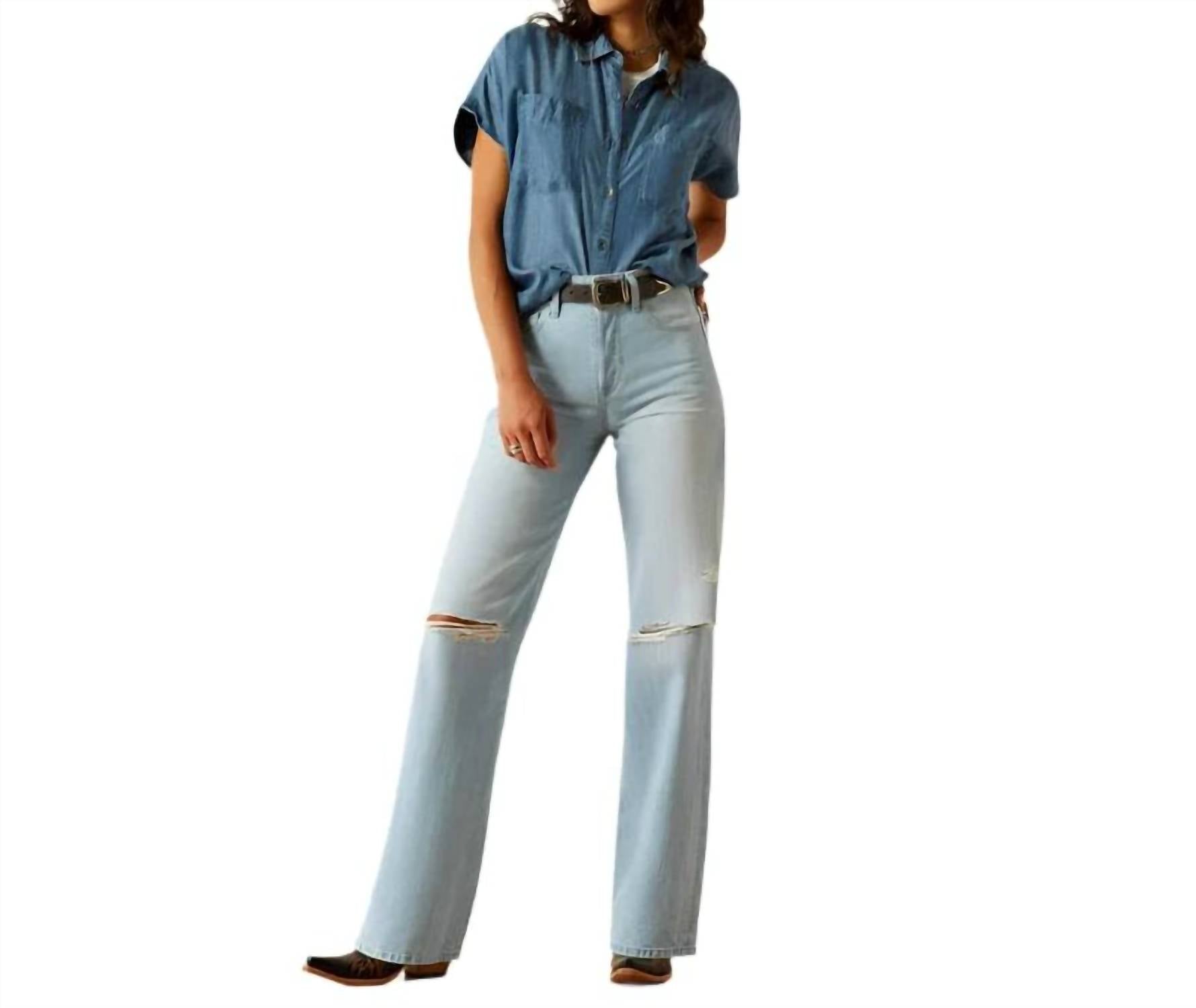 Perfectly tailored and soft to the touch. Elevate your summer wardrobe with the ARIAT Vacation Shirt, a stylish chambray piece perfect for warm weather. This button-down shirt features short sleeves and a spread collar, crafted from 100% Tencel for a breathable and smooth feel. With its western back yoke and functional double chest pockets, it combines classic design with practical elegance. Closure: Button closure. Care: Machine wash.