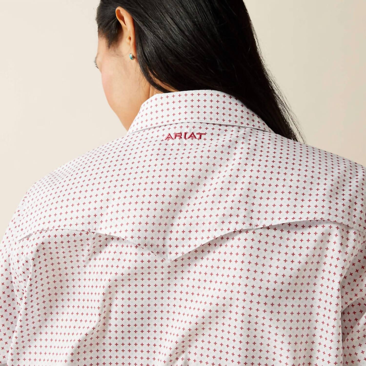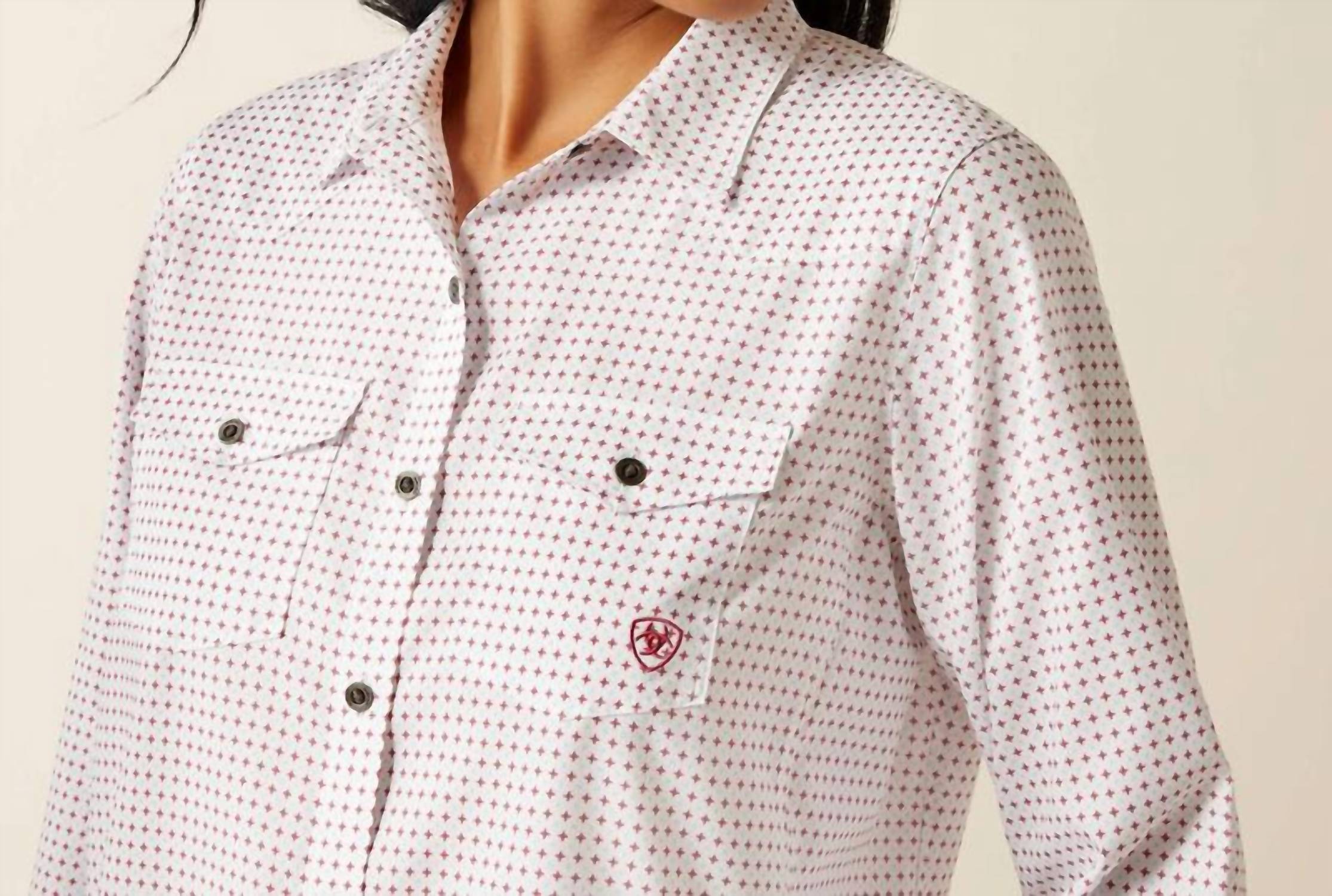 A classic button down shirt that will never go out of style. Elevate your wardrobe with the ARIAT Western Venttek Stretch Shirt in a stylish mini print geometric pattern. Crafted from 100% Polyester with Tek woven material, this long sleeve button-down offers a perfect blend of Western aesthetics and modern functionality. The shirt features innovative VentTEK™ technology for enhanced airflow, Sun Protection Fabric™, and a mesh yoke lining to keep you cool and comfortable. With a convenient button closure and machine washable care instructions, it's a practical and stylish choice for any occasion.