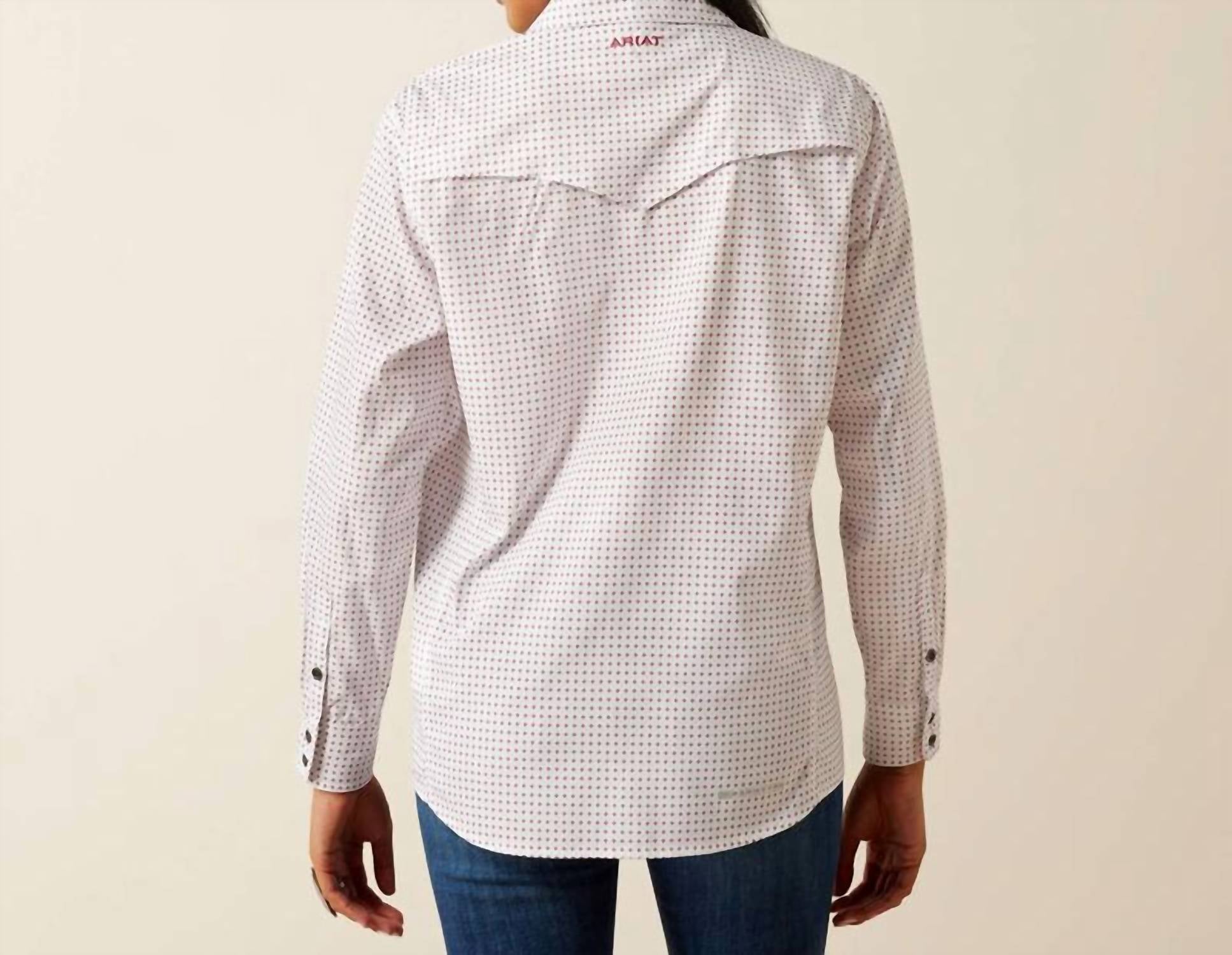 Elevate your wardrobe with the ARIAT Western Venttek Stretch Shirt in a stylish mini print geometric pattern. Crafted from 100% Polyester with Tek woven material, this long sleeve button-down offers a perfect blend of Western aesthetics and modern functionality. The shirt features innovative VentTEK™ technology for enhanced airflow, Sun Protection Fabric™, and a mesh yoke lining to keep you cool and comfortable. With a convenient button closure and machine washable care instructions, it's a practical and stylish choice for any occasion.