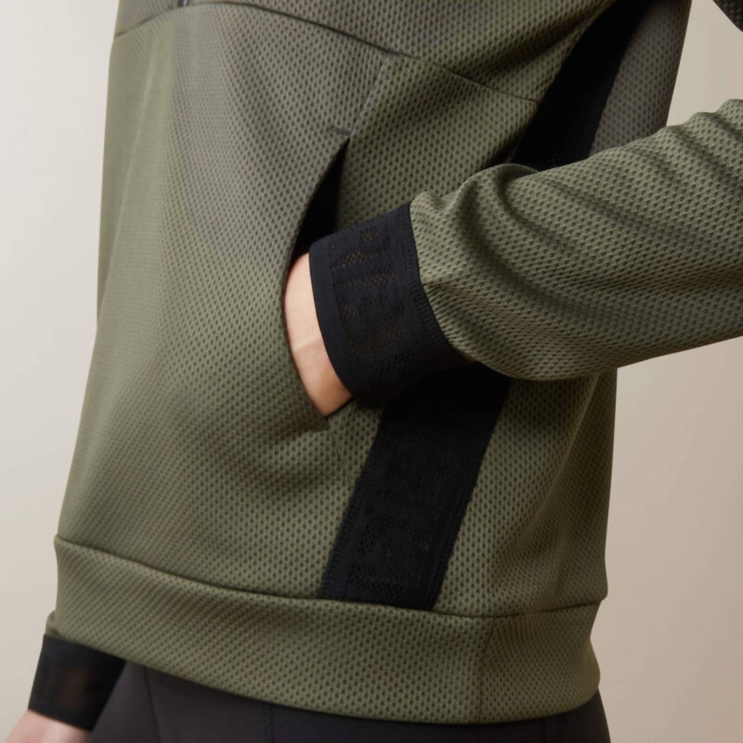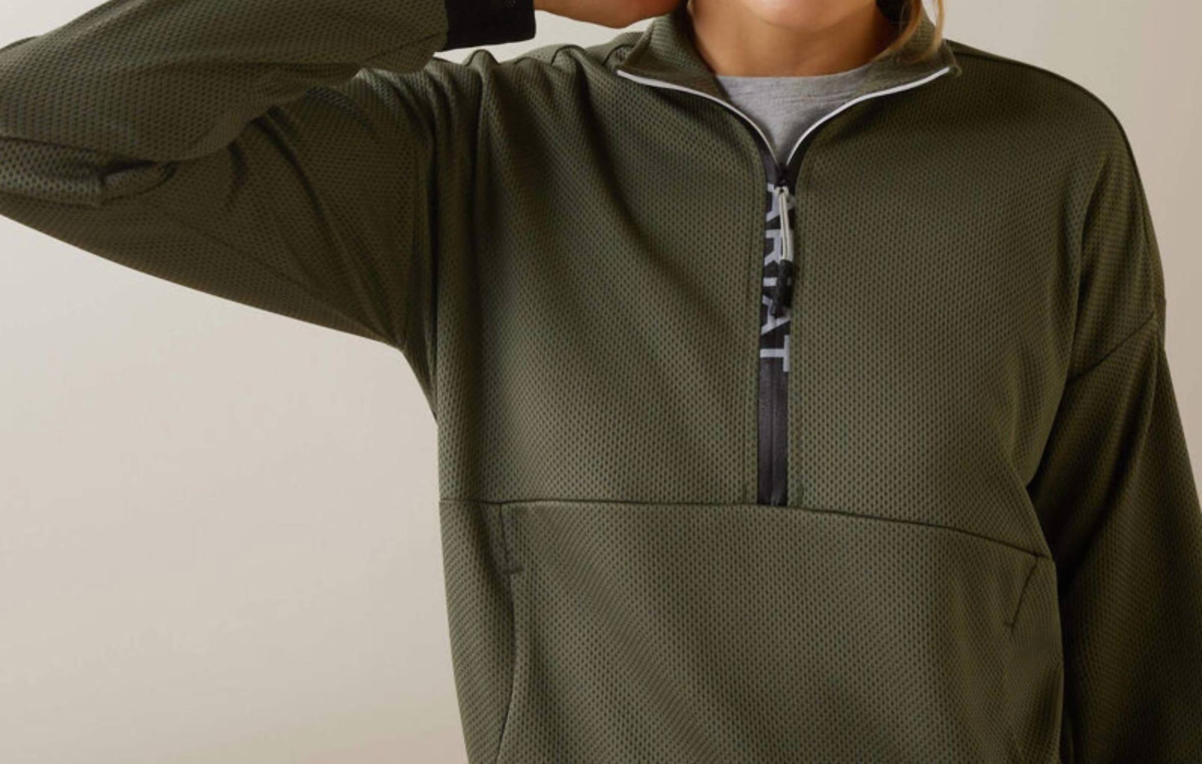 Whether you're running around town or lounging at home, this sweatshirt works for both. Discover the Ariat Women's Breath Zip Sweatshirt in Beetle, designed for activewear enthusiasts with long sleeves and a sleek mockneck. Crafted from 100% recycled polyester using a lightweight double-knit, this sweatshirt includes a modern kangaroo pocket and features flattering raglan styling. Incorporating AriatTEK moisture movement technology, it's perfect for your fitness workouts. Closure: Zip closure. Care: Machine wash and tumble dry.