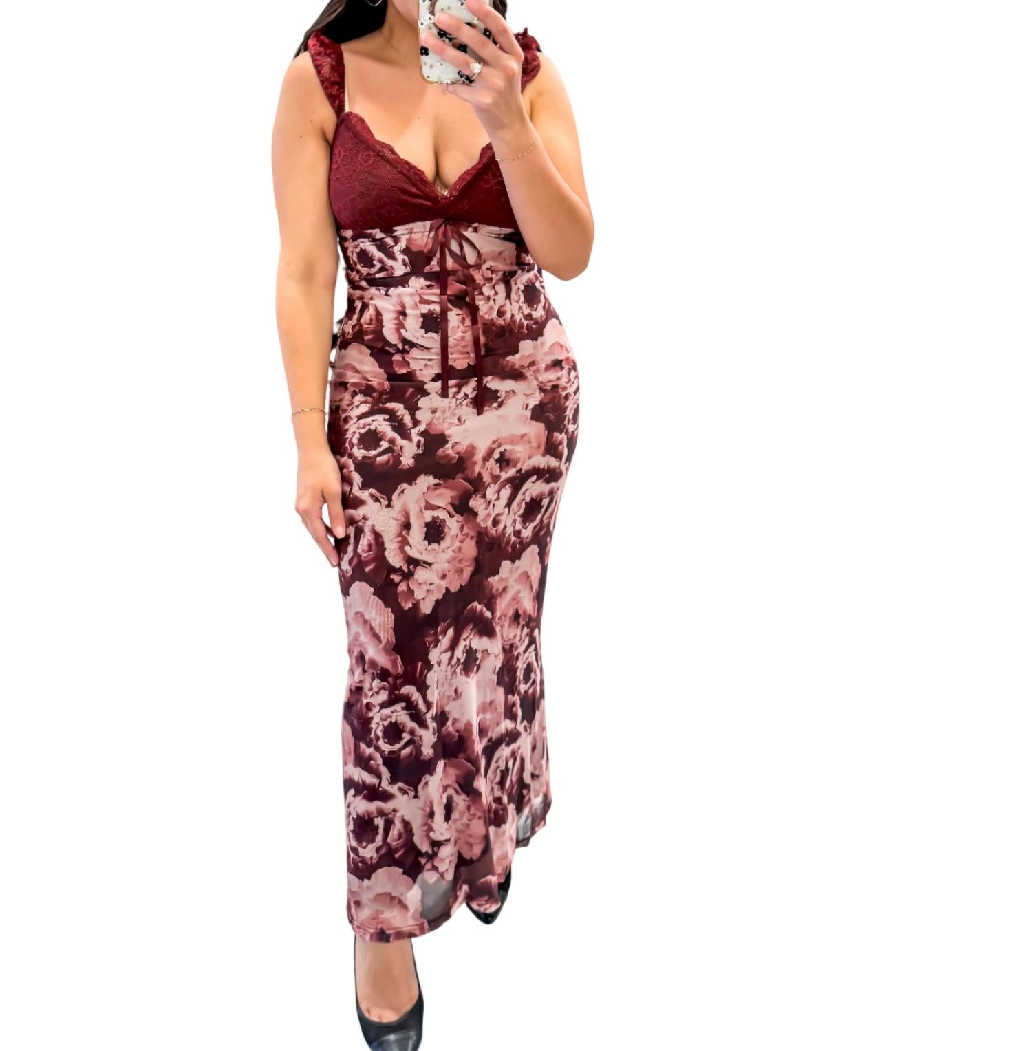 The Better Than Ever Maxi Dress by Bailey Rose is an elegant choice for a night out, featuring a floral pattern in rich wine and dark mauve tones. This sleeveless dress is crafted with a lace top and flutter sleeves, offering a sophisticated bodycon silhouette with a flattering V-neckline. Made from mesh fabric with great stretch and a double-lined design, this maxi-length dress ensures both comfort and style. With sizes ranging from extra small to large and true-to-size fitting, Melissa showcases the small (4'10" height, size 4 dress, 27" waist, 32D bra).