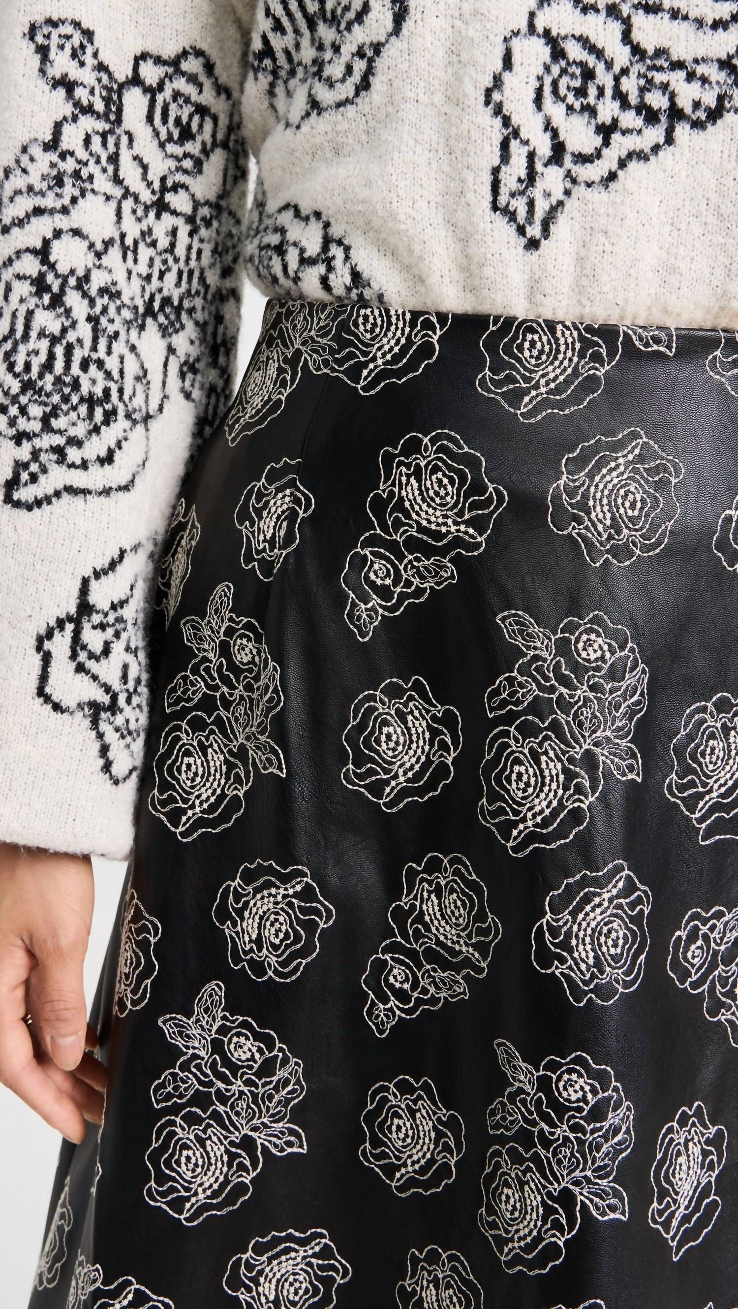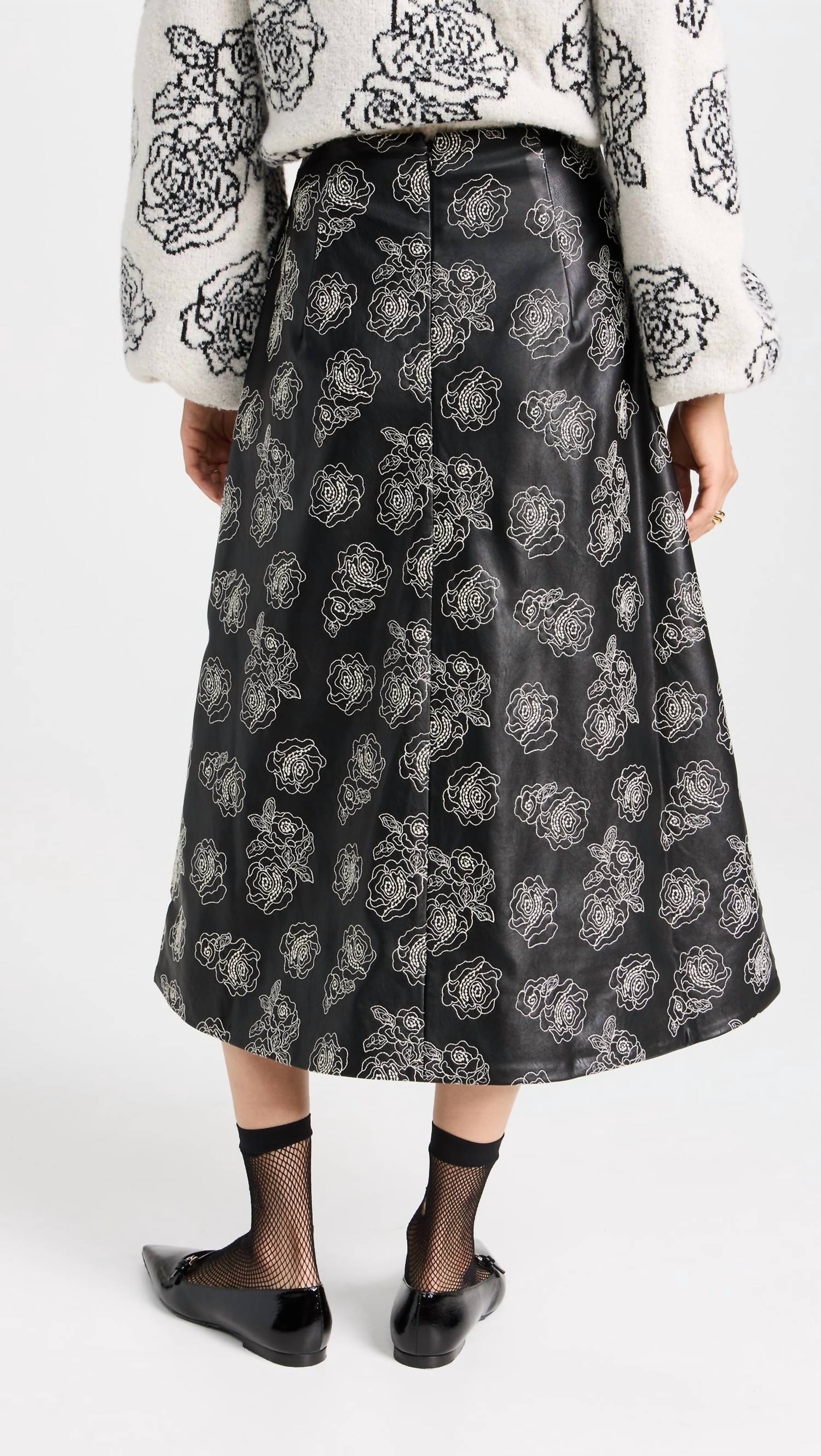 Tuck your favorite tee into this midi length skirt for an effortlessly cool look. Introducing the Shari Skirt by BAUM UND PFERDGARTEN, featuring a charming floral embroidery in Black Stitch Flower. With a garment length of 31.5 inches, this midi skirt is crafted from mid-weight, non-stretch faux leather, boasting a shell composition of 100% polyurethane. The skirt is thoughtfully designed with on-seam hip pockets and a convenient hook-and-eye with hidden back zip closure, ensuring a seamless fit. Care for this imported piece by washing it cold to maintain its elegance.
