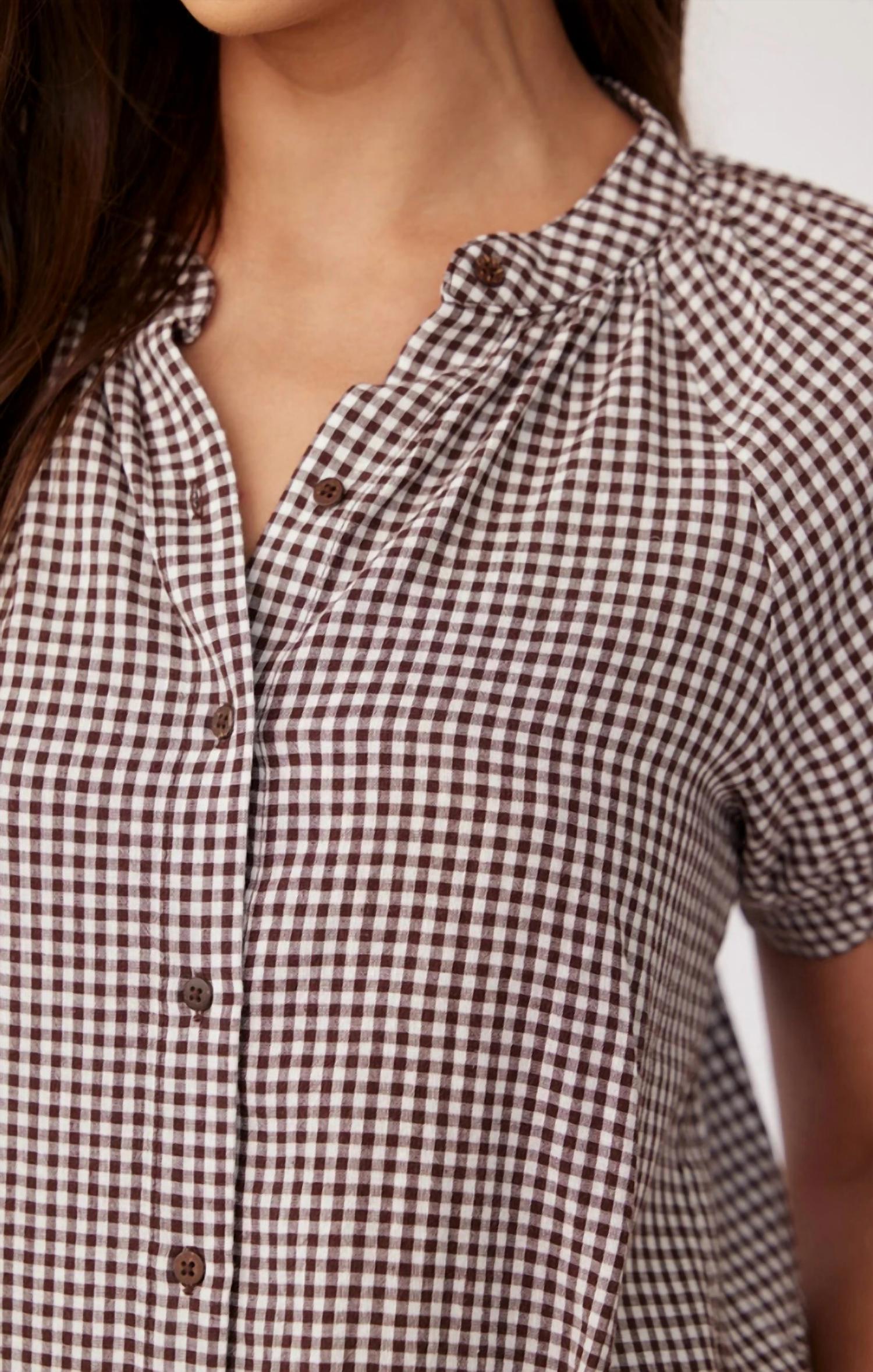A classic button down shirt that will never go out of style. Elevate your spring wardrobe with the Bella Dahl Short Sleeve Raglan Shirt, a chic brown micro gingham piece perfect for any vacation occasion. This on-trend top features short puff sleeves and a flattering slimmer bodice, accentuating your figure effortlessly. Crafted from a comfortable blend of 79% Rayon and 21% Linen, it includes a functional button closure for versatile styling with or without layering. For care, simply machine wash to keep this wardrobe essential in top condition.