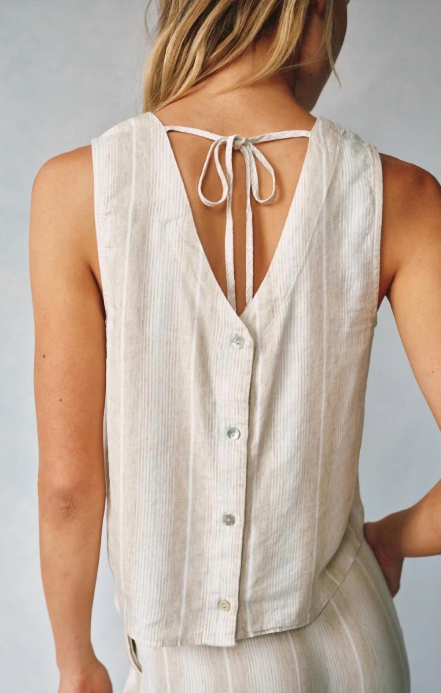 A versatile blouse that works from desk to dinner! Introducing the Sleeveless Button Back Top by Bella Dahl, a chic piece in Positano Sand Stripe perfect for your warm-weather wardrobe. This blouse offers a classic crew neckline with a relaxed silhouette, featuring a deep V-back with a tie for an elevated touch. Made from a blend of 67% Rayon and 33% Linen, it ensures comfort and style. Closure: Back button closure. Care: Hand wash and lay flat to dry.
