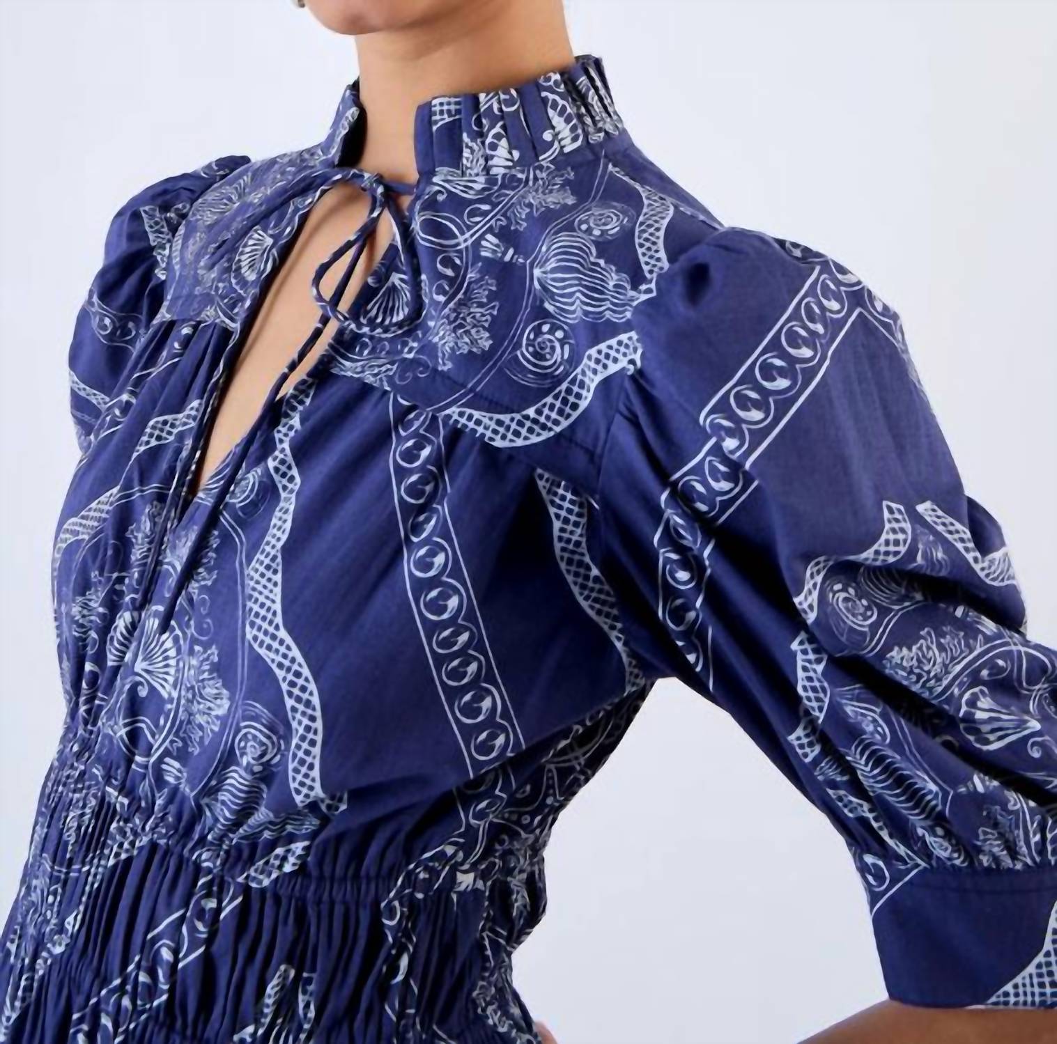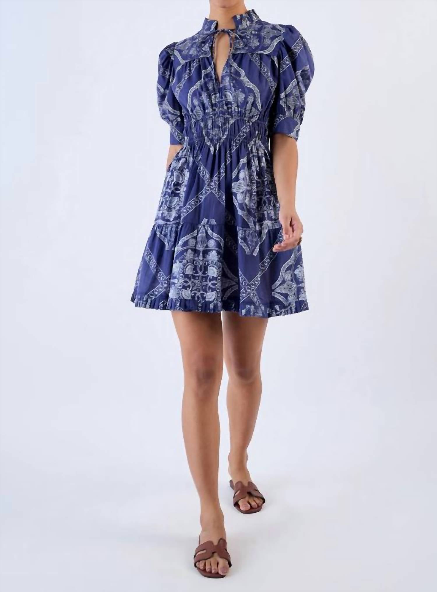 A short and breezy dress for those warmer days. Embrace the charm of Boho Chic with the Women's Alice Mini Dress by BEYOND by Vera, perfect for summer festivities. This shirt silhouette features elbow sleeves and a deep V-neckline, adorned with hand-drawn graphic prints in the captivating Sea Bounty Navy hue. Made from 100% cotton, the dress highlights pleating and smocking details along with a flattering silhouette and pocket functionality. Closure: Pull-on. Care instructions include hand wash and lay flat to dry.