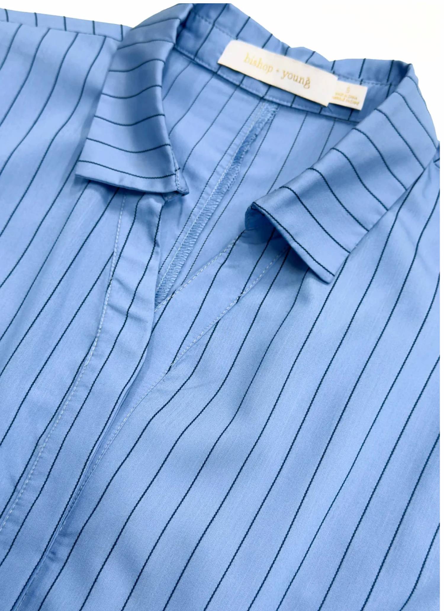 The perfect length dress does exist. The Margaux Dress by bishop + young is the epitome of elegant summer style with its blue stripe pattern and modern shirt silhouette. Featuring a collared V-neckline and cap sleeves, this dress is crafted from a comfortable blend of 50% cotton, 38% polyester, and 12% nylon. Its midi length is complemented by a button front closure and a self-tie waist, enhancing an hourglass figure. This piece effortlessly combines comfort and sophistication for the modern woman.