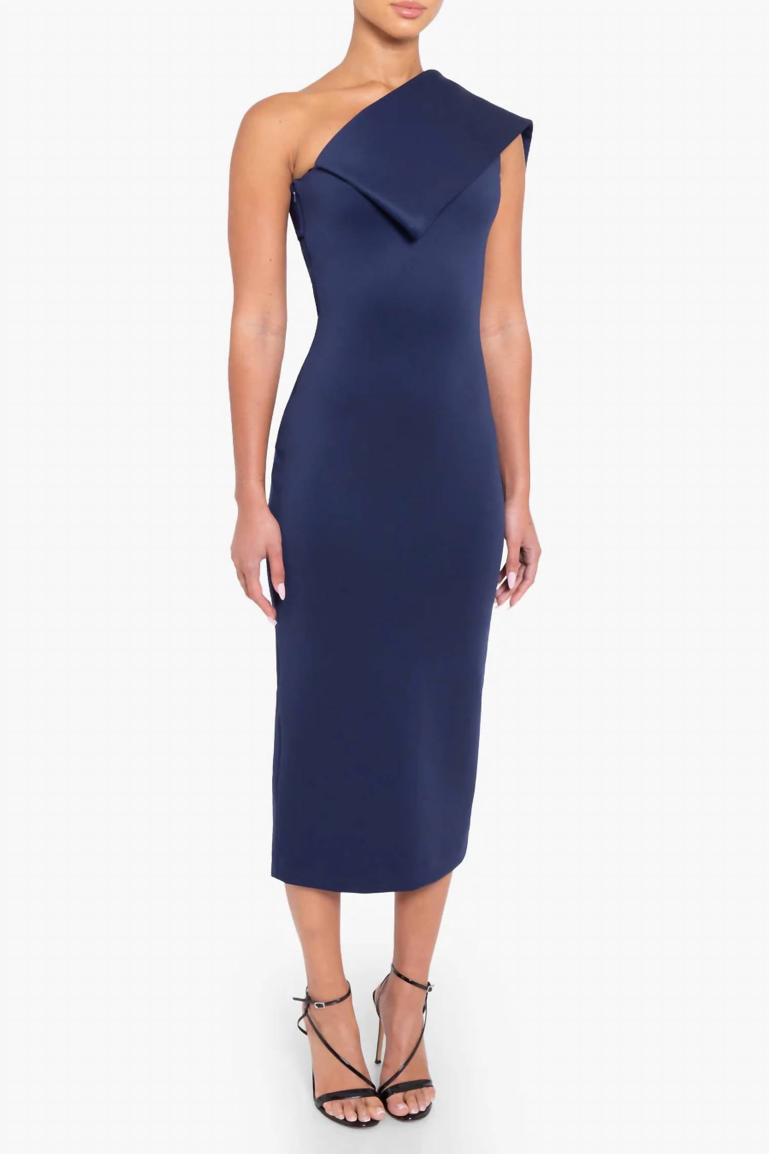 Nothing wrong with a little shoulder action. Introducing the Dolores Cocktail Midi Dress by Black Halo, crafted in a solid Pacific Blue color for a standout evening look. This sleeveless, one-shoulder dress features a unique overlay shoulder detail and a bodycon silhouette, offering both comfort and style. Made from a composition of 90% Polyamide and 10% Elastane with a stretch knit fabric, it acts as subtle shapewear. Designed with a side zipper closure for a sleek fit, this dress requires dry cleaning to maintain its pristine condition.