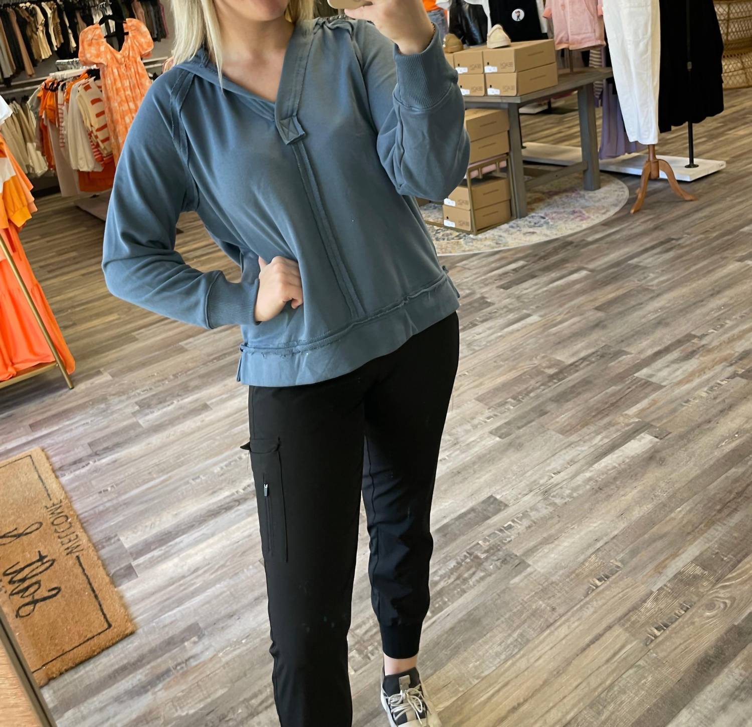 Whether you're running around town or lounging at home, this sweatshirt works for both. Elevate your casual wardrobe with the Raw Edge Hooded Pullover by Blu Pepper, a stylish choice in dusty blue. This women's hoodie features a hooded v-neckline and long sleeves, with textured raw edge detailing throughout for added flair. Crafted as a pullover style, it offers effortless wear and is ideal for those who prefer a true-to-size fit or wish to size up for a more relaxed silhouette.