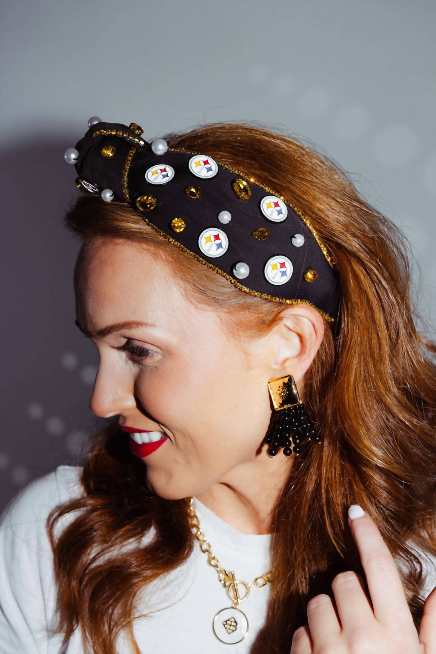 Introducing the Pittsburgh Steelers Logo Headband by Brianna Cannon, an eye-catching black accessory that showcases your team spirit with style. This headband features gold plated logo charms and hand-sewn gold crystals for a luxurious touch. Officially licensed by the NFL, it offers comfort and is ideal for everyday wear. Perfect for adding a bit of glamour to your game day ensemble.
