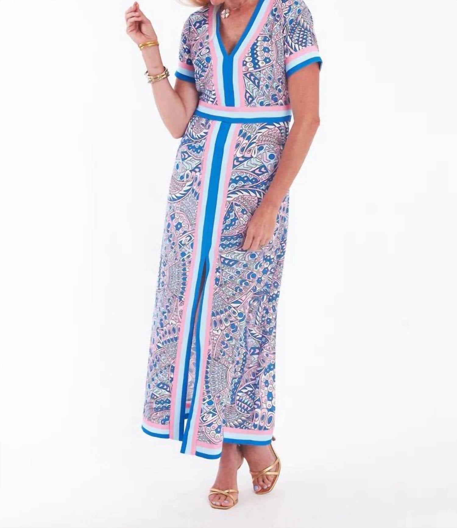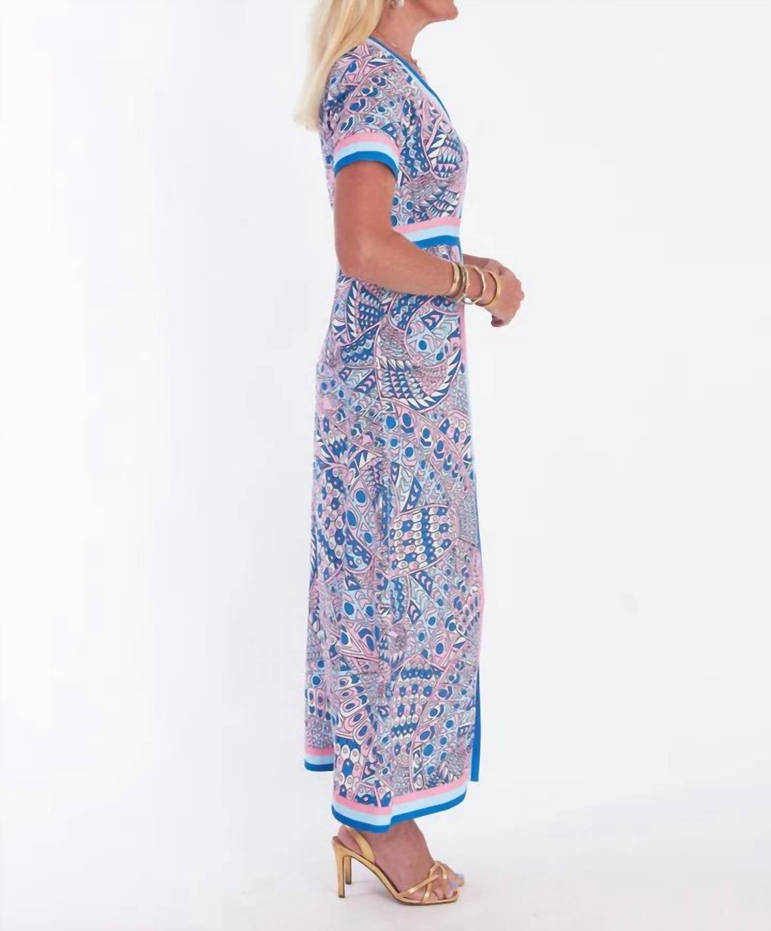Who doesn't love a good maxi dress? This one you'll be reaching for season after season. CK BRADLEY's Leland Maxi Dress is your go-to piece for a vacation-ready look with a maximalist flair. This A-line dress features short sleeves and a V-neckline, crafted from durable polyester in a striking blue/pink patterned design. Flaunting a vintage-inspired silhouette, it boasts a contrasting trim and an elongating line with a front slit, perfect for any summer occasion. Fasten it up easily with a zip closure and enjoy carefree maintenance with machine wash and tumble dry care instructions.
