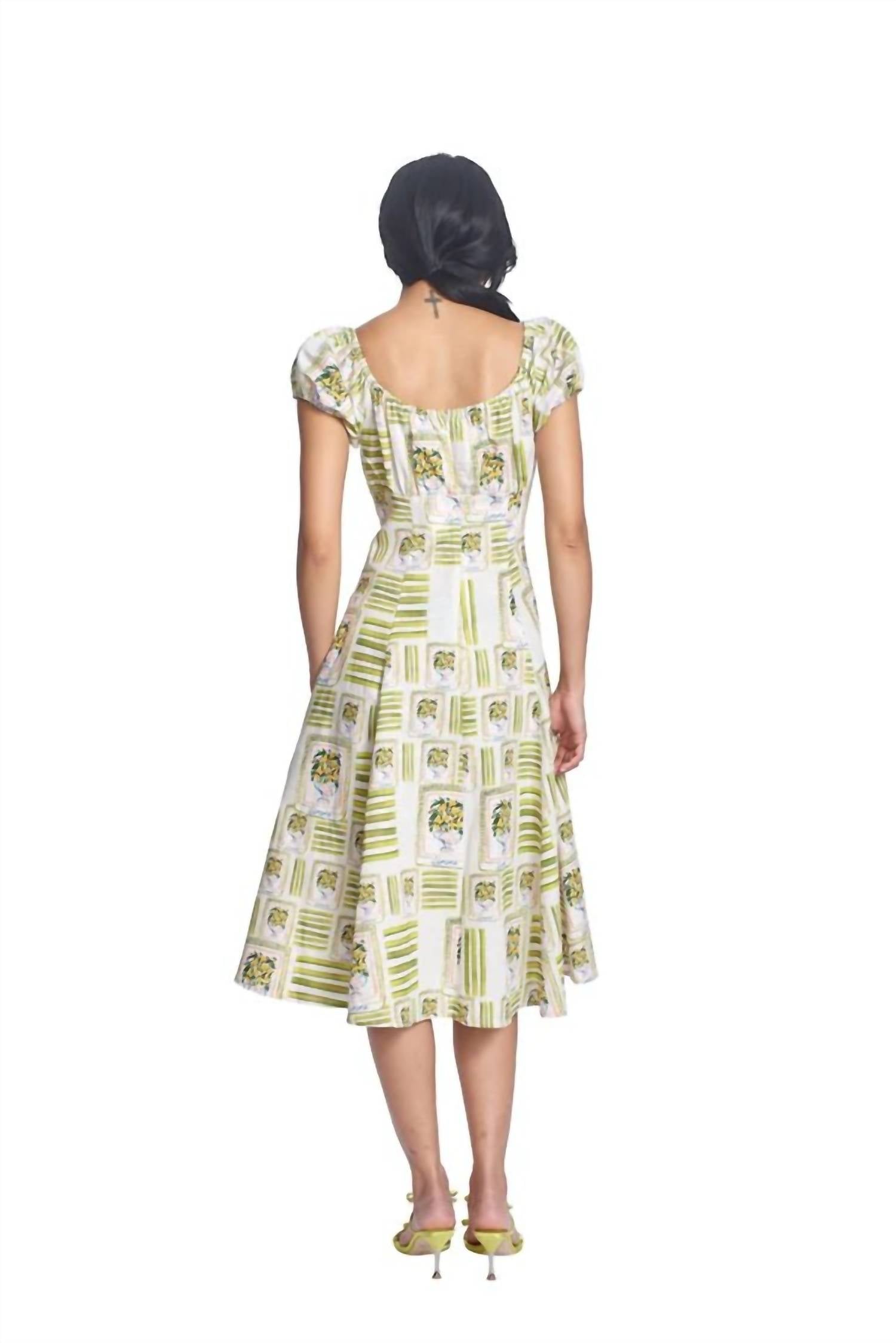The perfect length dress does exist. Introducing the Cordelia Midi Dress by Corey Lynn Calter, a stunning lemon-hued piece perfect for vacation-ready style. Featuring short sleeves and an A-line silhouette, this dress is crafted from55% Cotton and 45% Linen for comfort and elegance. Designed with a scoop neckline, it offers a patterned maximalist look for any summer occasion. Closure: Zip closure. Care: Hand wash in cold or lukewarm water using a gentle, mild detergent . Alternatively, machine wash on a delicate cycle in cold or lukewarm water