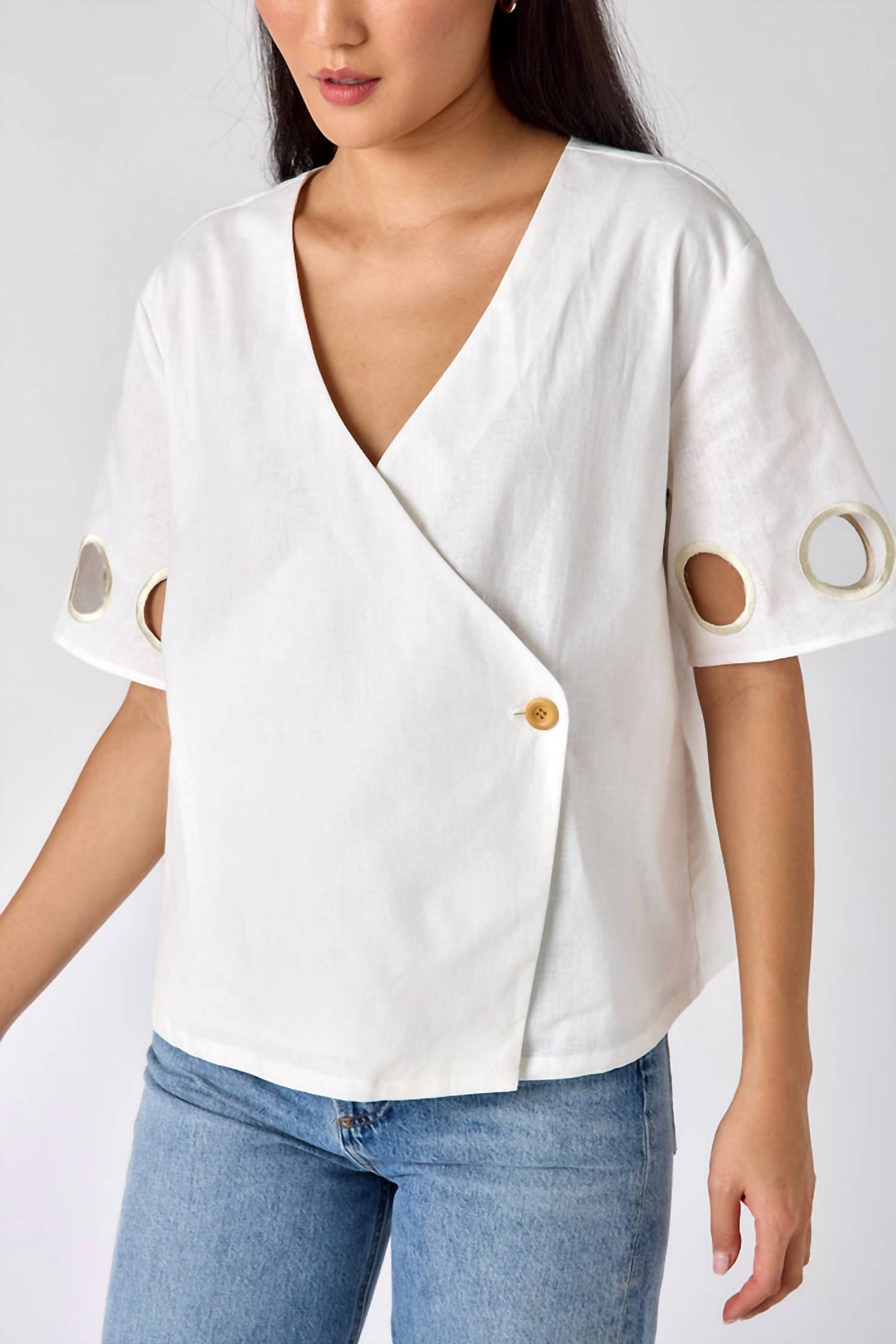 A timeless blouse that will never go out of style. Introducing the Coen Top by Crosby by Mollie Burch, a chic addition to your spring wardrobe. This hip-length blouse in white features short sleeves and a flattering V-neckline with a hidden snap for added security. Crafted from a mediumweight linen and cotton blend, it offers durability with a smooth handfeel and elegant drape. Closure: Kimono-style button closure. Care: Dry clean only. Length: 24.5 inches (size small).