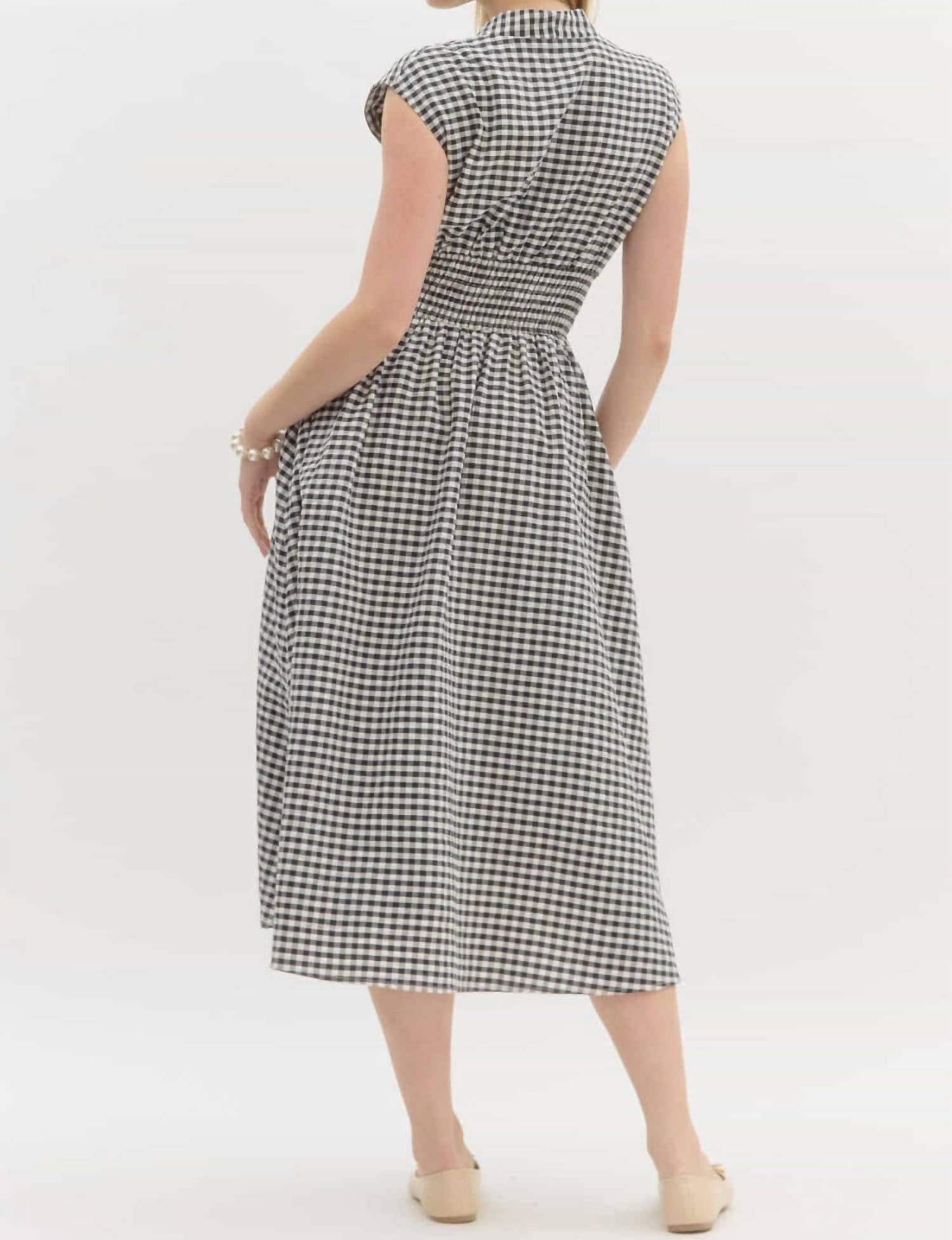 Casual, comfortable and cute! The dress that you'll be reaching for all season long. The Charlotte Gingham Midi Dress by Entro is the epitome of timeless elegance combined with modern chic. This sleeveless dress is crafted with a classic black-and-white gingham pattern, featuring a V-neck and a flattering A-line silhouette. Garment Length: Midi. Closure: Convenient zip closure. Care: Machine wash. This dress is perfect for a range of occasions, from casual outings to elevated events, ensuring style and comfort throughout the day.