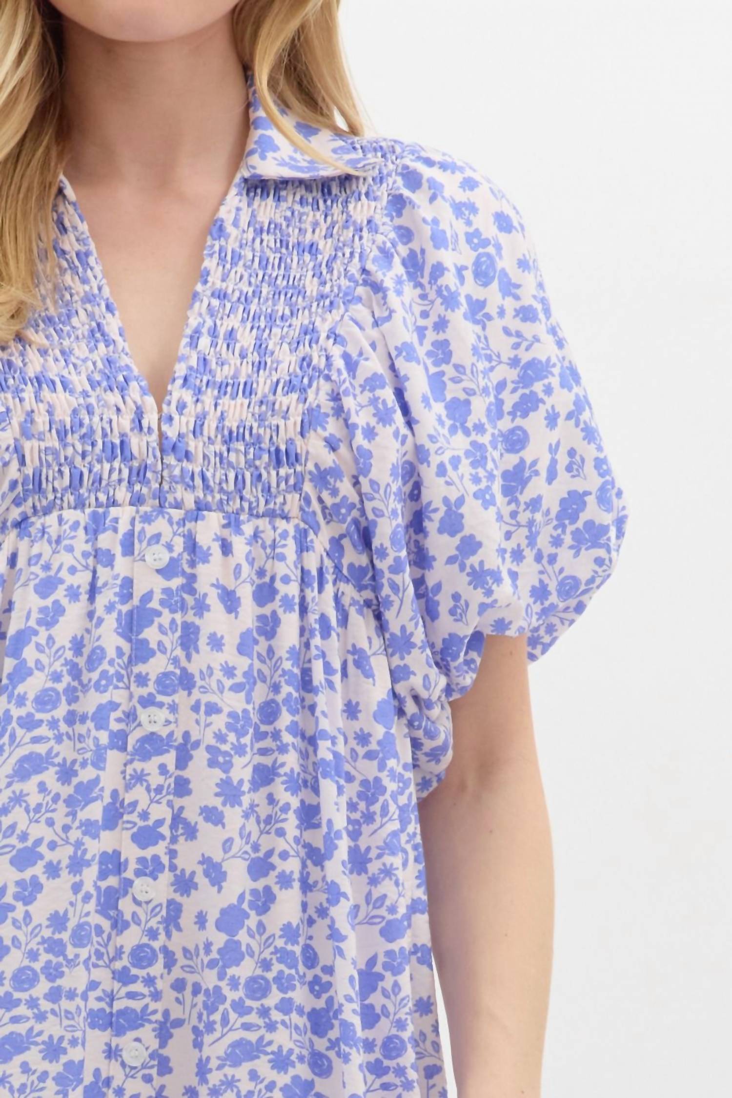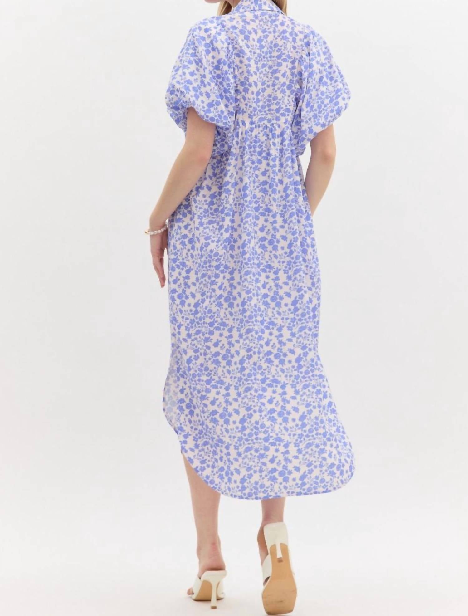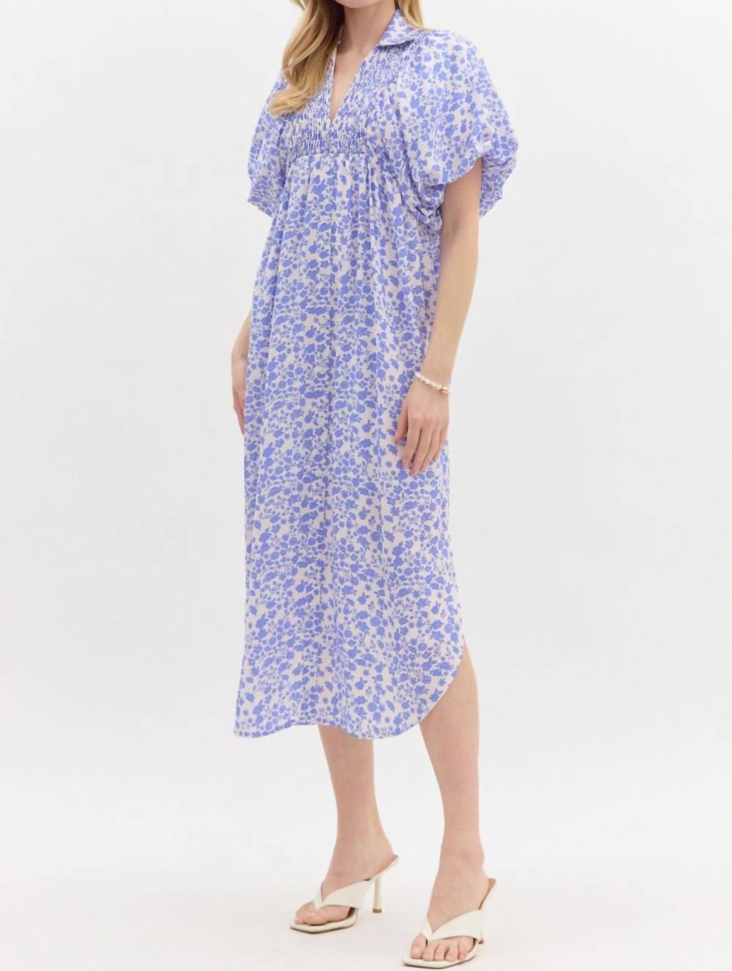 A midi dress so versatile, your options for wearing it are endless. Experience boho chic elegance with the Claire's Lover Dress by Entro in a delightful blue ditsy floral print. This women's empire waist midi dress features short bubble sleeves and a v-neck collar for a sophisticated silhouette. The smocking and button detail accentuate the design, while the round hem with slit sides adds a stylish flair. Made from lightweight, non-sheer fabric, this versatile dress is a perfect addition to your summer travel wardrobe.