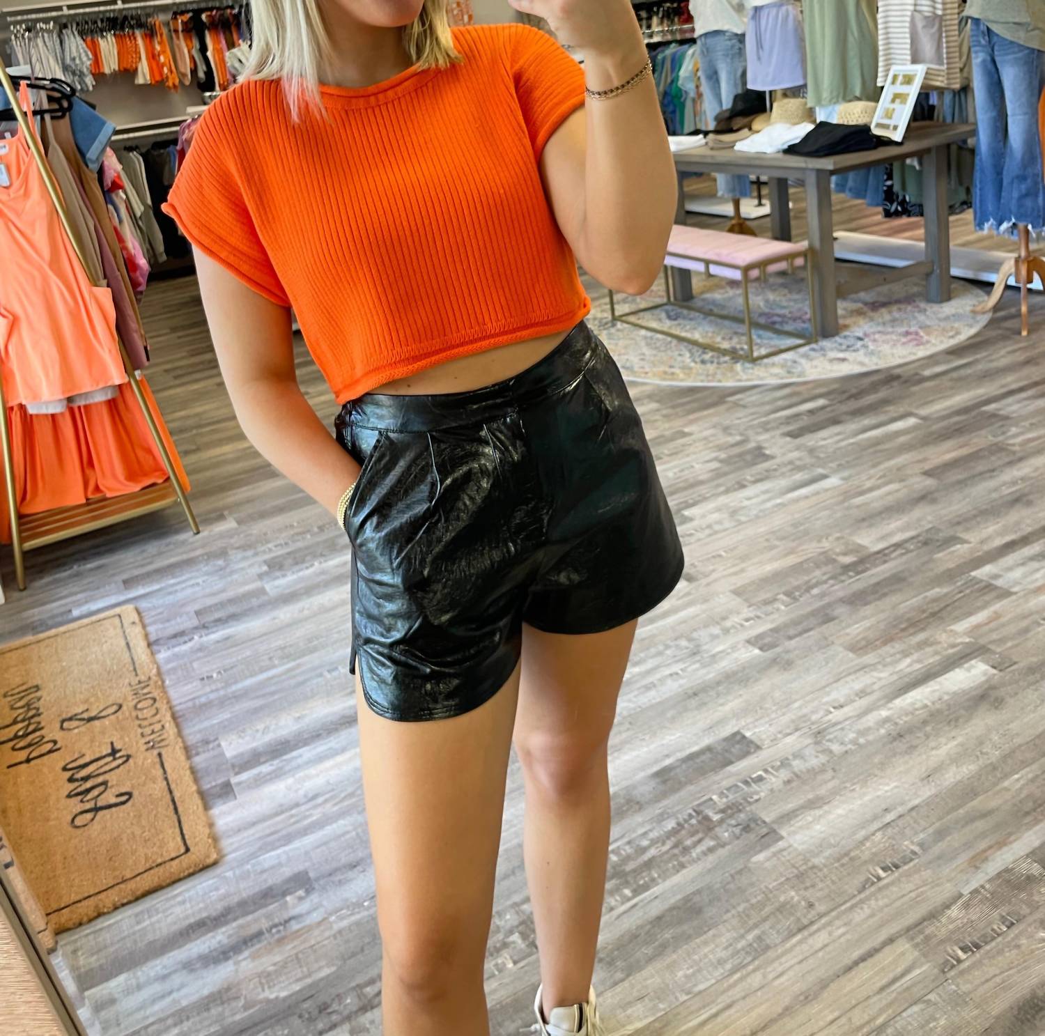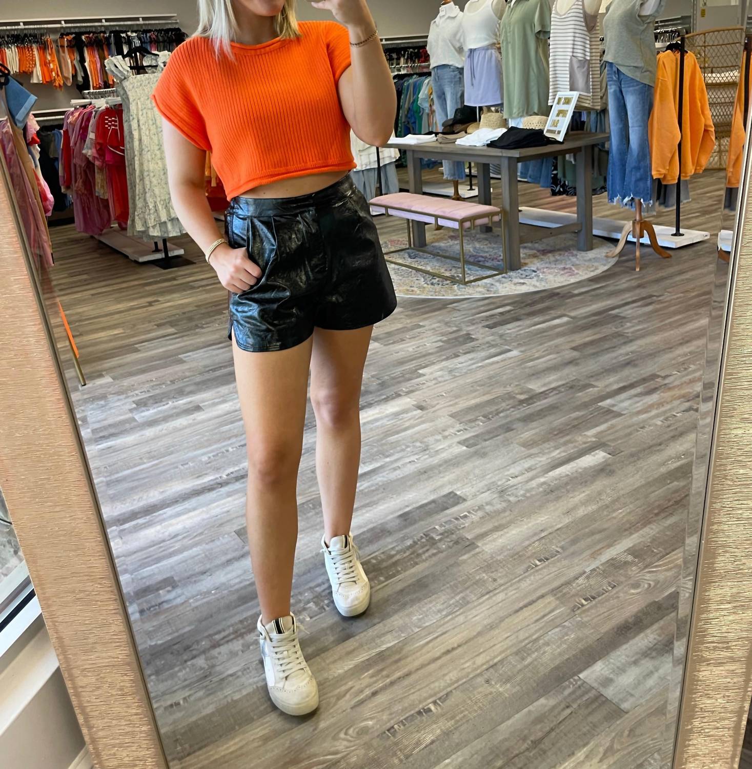 Fit to perfection, we love these high-waist shorts and you will too. The High Waisted Leather Shorts by Entro are designed for chic, modern style with a solid black finish. These high-waist shorts feature a dolphin hem for a flattering look and include a convenient hook and eye closure. Crafted from durable polyurethane, they ensure both comfort and a sleek appearance. Care for these shorts by spot or wipe cleaning. Model wears medium, and the design runs true to size.