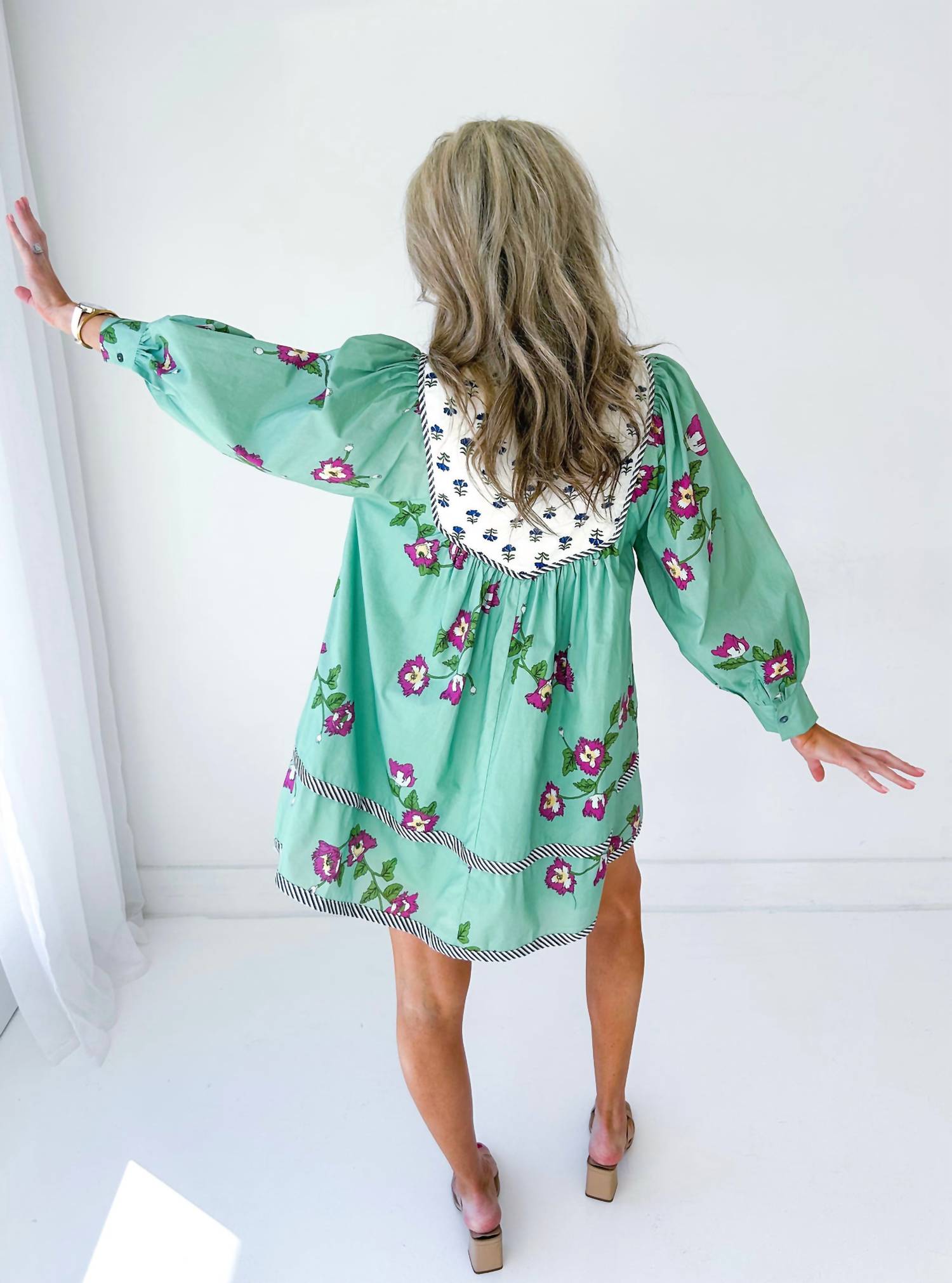 The perfect mini dress for those warmer months. Step into spring with the Only You And I Floral Dress by Entro, a boho-chic mini dress in a refreshing pistachio hue. Featuring three-quarter bishop sleeves and a flattering A-line silhouette, this pullover dress is crafted from 100% cotton for a lightweight and comfortable feel. The dress includes side pockets for practicality and a charming round neckband with a front tie closure. Care for this stylish piece with machine wash instructions, making it perfect for any vacation occasion.
