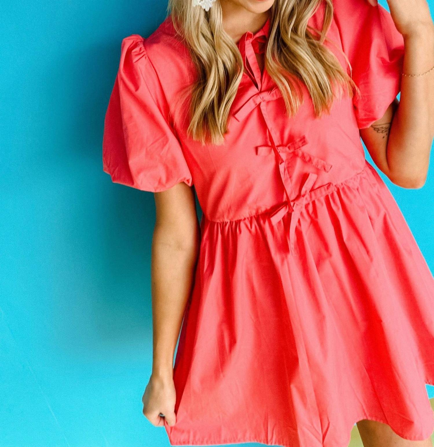 The kind of easy and flattering dress you'll be reaching for all season long. Meet the Steely Balloon Sleeve Mini Dress by Entro, a delightful addition to your evening wardrobe. This playful coral dress features short puff sleeves and a charming bow detail at the back for a touch of whimsy. Made from 80% Polyester and 20% Cotton, it showcases a solid pattern in an A-line silhouette, complemented by a crew neckline. Closure: Tie closure. Care: Hand wash only. Perfect for springtime occasions.